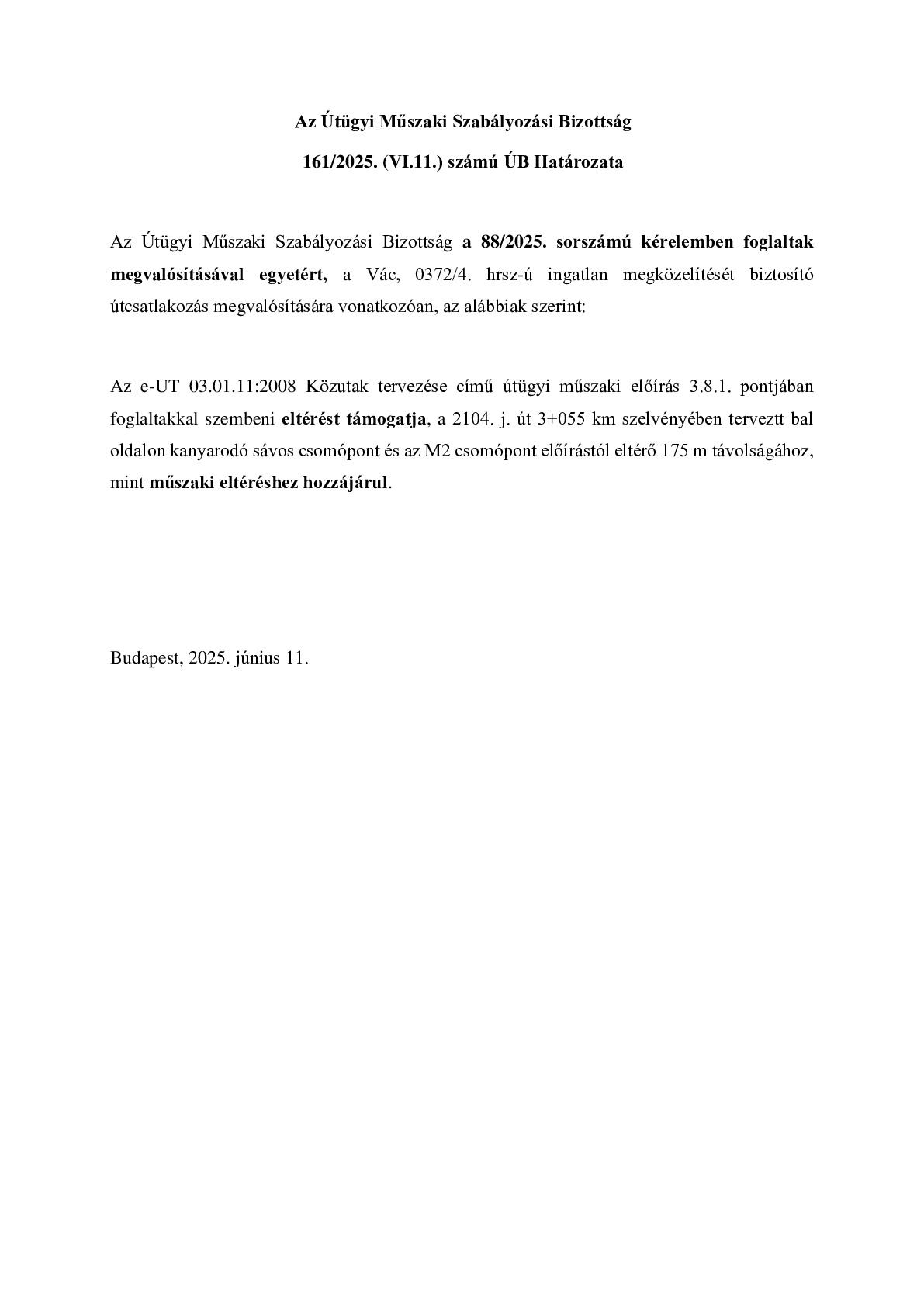 161/2025. (VI.11.) ÚB határozat - Vác, 0372/4. hrsz-ú ingatlan megközelítését biztosító útcsatlakozás megvalósítása