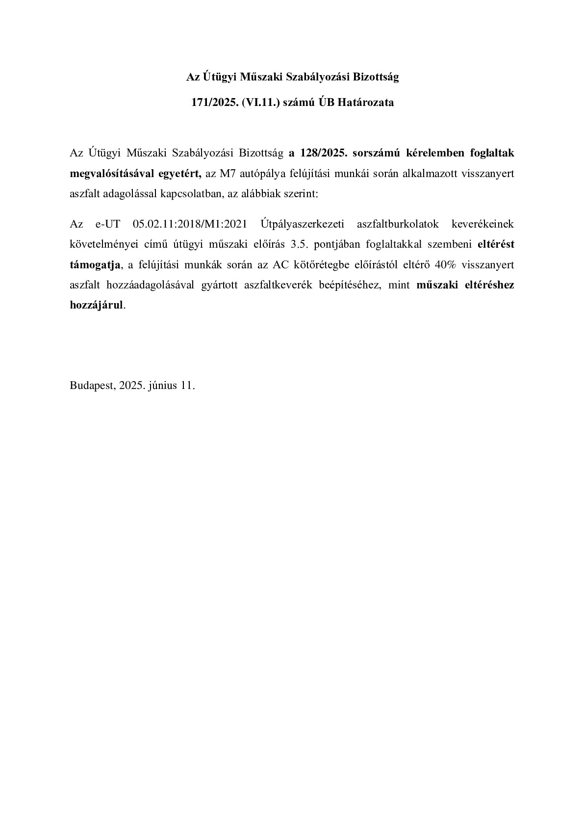 171/2025. (VI.11.) ÚB határozat - M7 autópálya felújítási munkái során alkalmazott visszanyert aszfalt adagolás