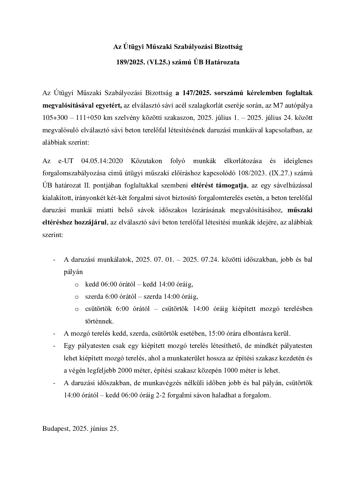 189/2025. (VI.25.) ÚB határozat - forgalomterelés M7 autópálya 105+300 – 111+050 km szelvény közötti szakaszon