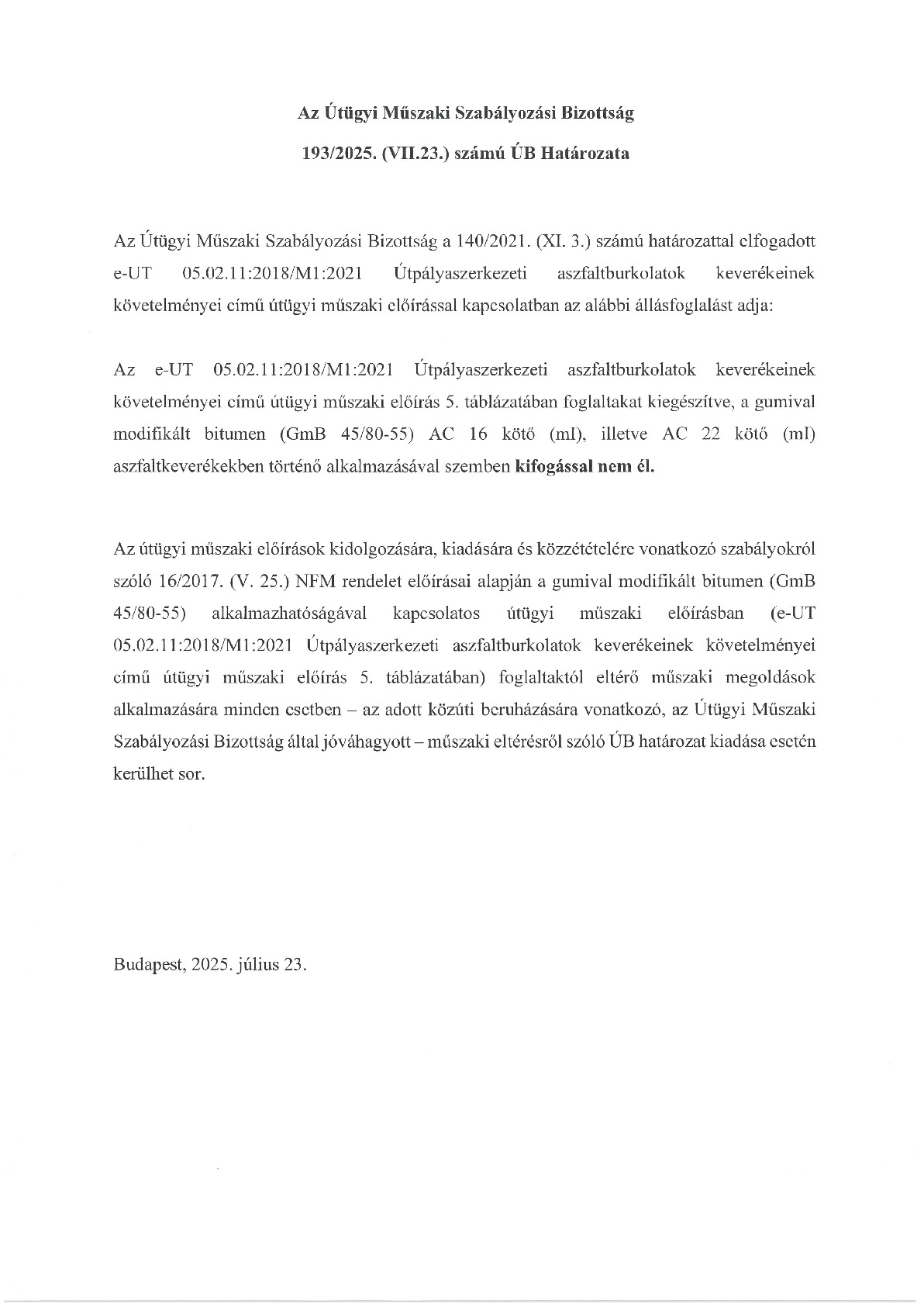 193/2025. (VII.23.) ÚB határozat - Az e-UT 05.02.11:2018/M1:2021 Útpályaszerkezeti aszfaltburkolatok keverékeinek követelményei című útügyi műszaki előírás 5. táblázatában foglaltakat kiegészítve, a gumival modifikált bitumen (GmB 45/80-55) AC 16 kötő (mI), illetve AC 22 kötő (mI) aszfaltkeverékekben történő alkalmazásával szemben kifogással nem él.