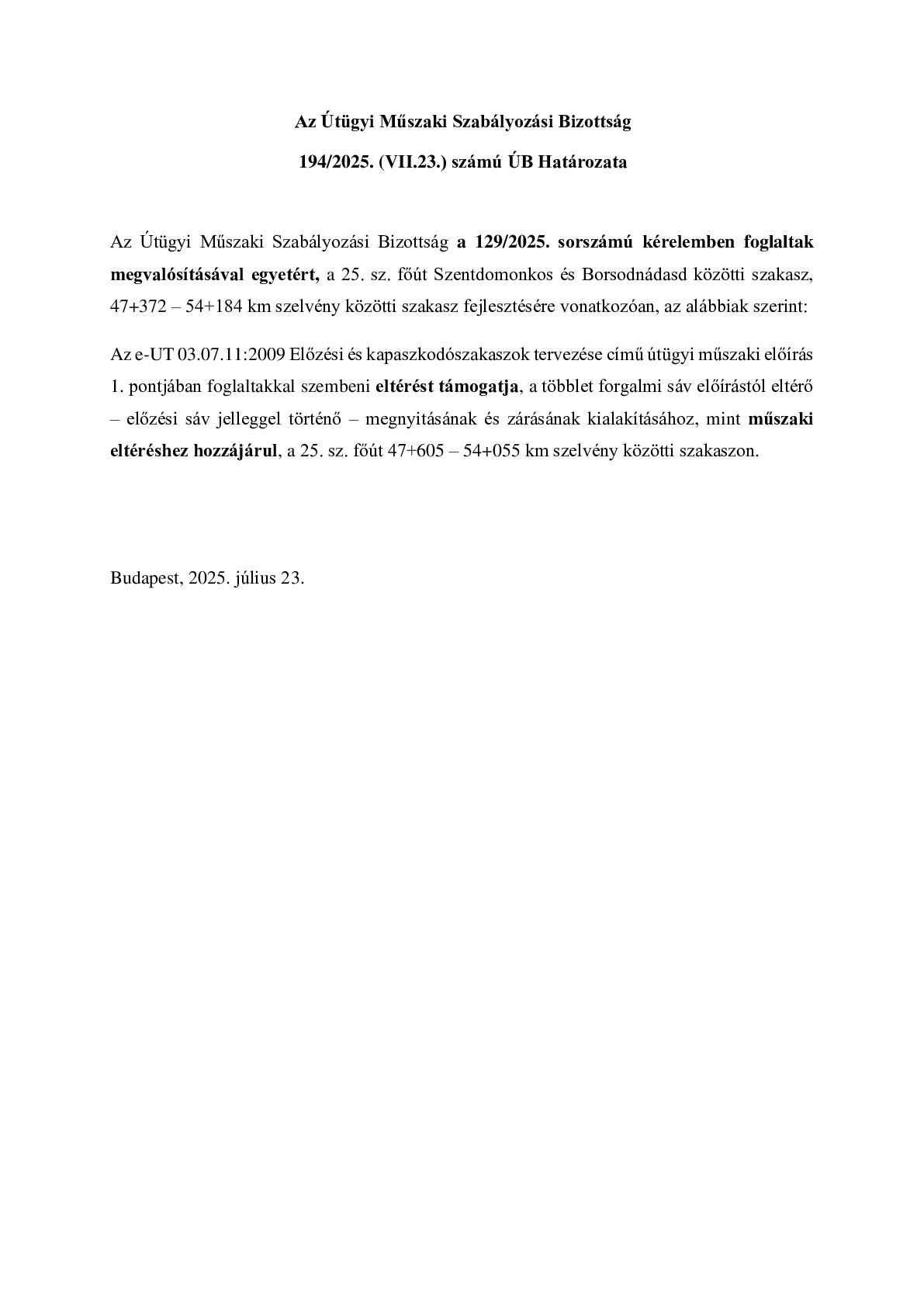 194/2025. (VII.23.) ÚB határozat - 25. sz. főút Szentdomonkos és Borsodnádasd közötti szakasz, 47+372 – 54+184 km szelvény közötti szakasz fejlesztése