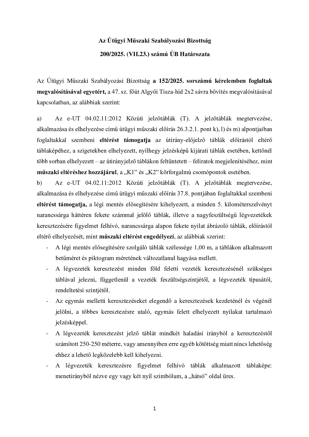 200/2025. (VII.23.) ÚB határozat - 47. sz. főút Algyői Tisza-híd 2x2 sávra bővítés megvalósítása