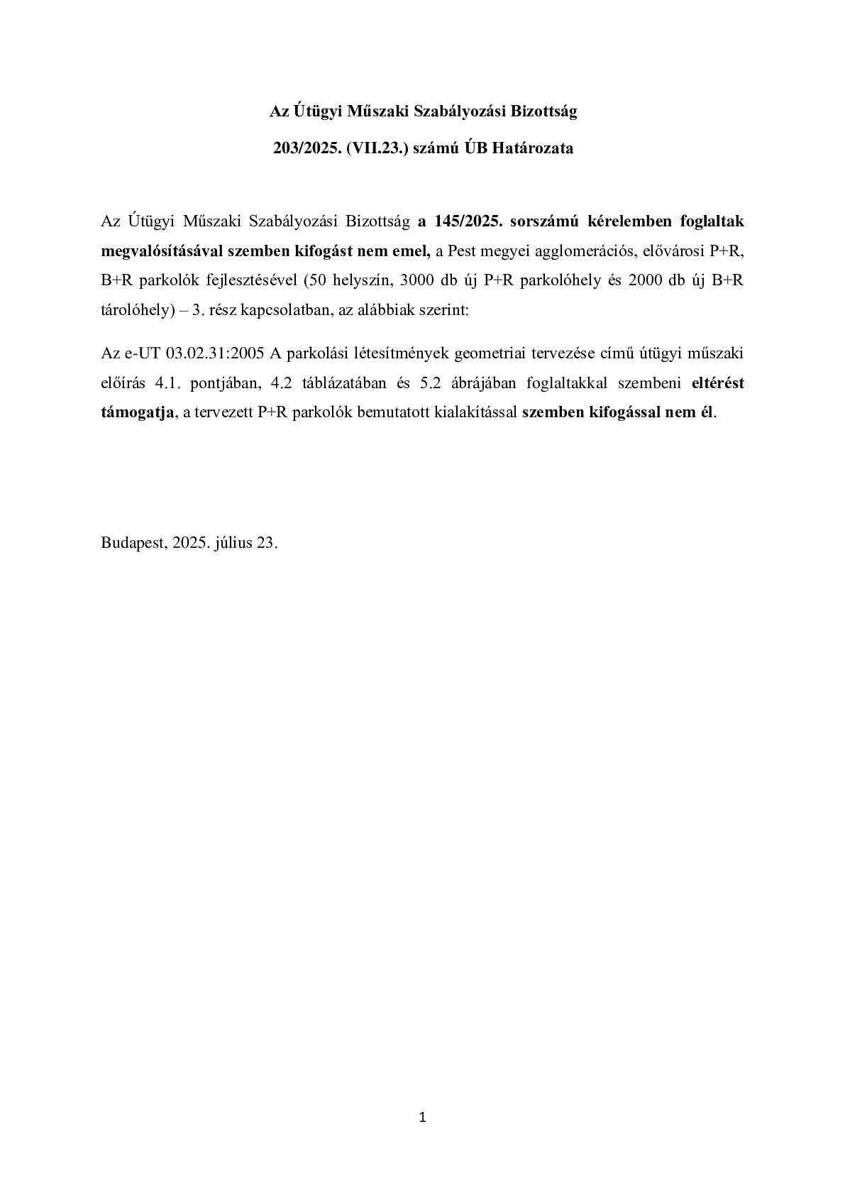 203/2025. (VII.23.) - Pest megyei agglomerációs, elővárosi P+R, B+R parkolók fejlesztésével (50 helyszín, 3000 db új P+R parkolóhely és 2000 db új B+R tárolóhely) – 3. rész kapcsolatban
