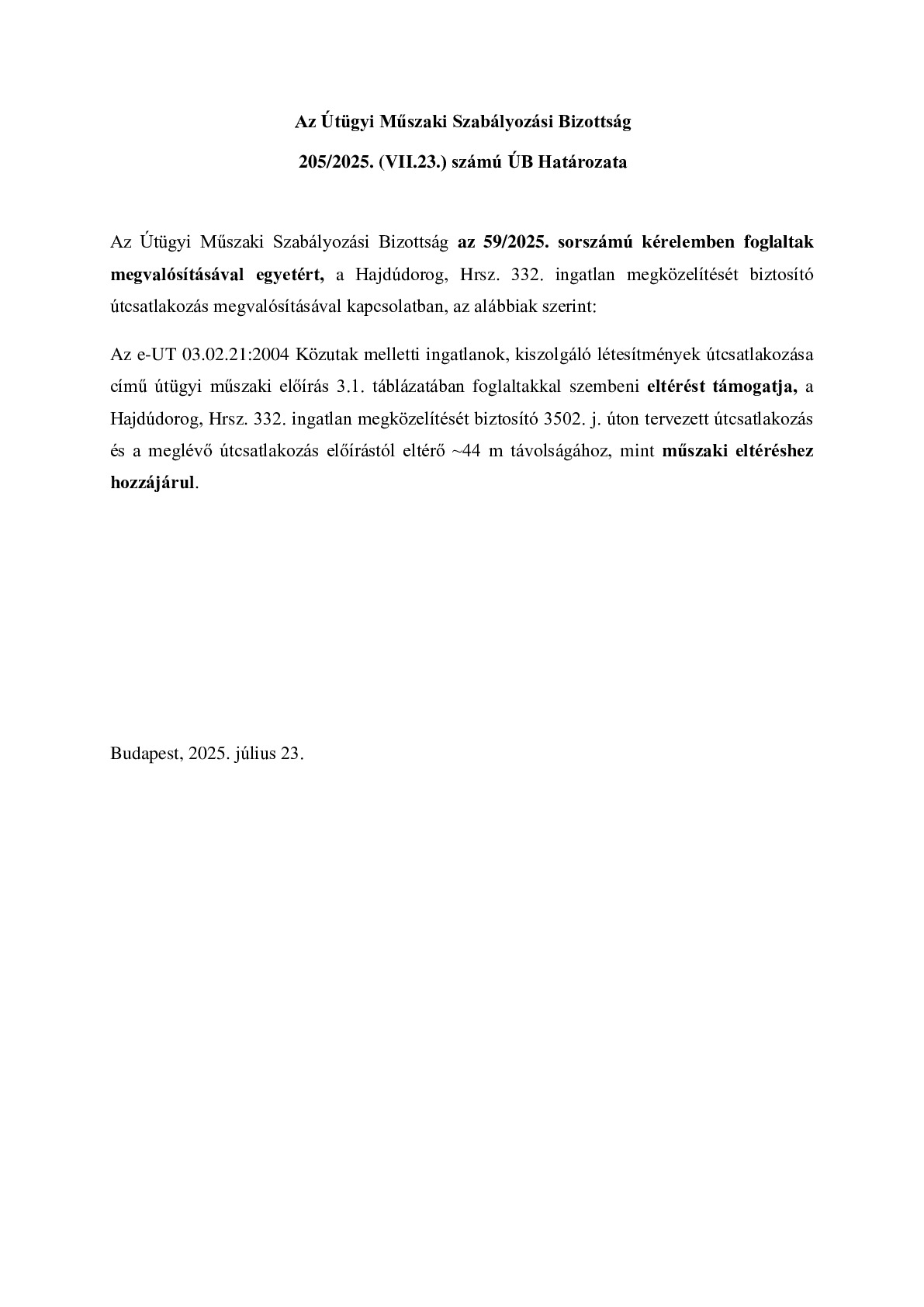 205/2025. (VII.23.) ÚB határozat - Hajdúdorog, Hrsz. 332. ingatlan megközelítését biztosító útcsatlakozás megvalósítása
