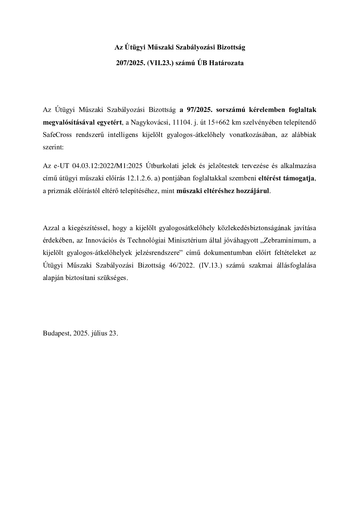 207/2025. (VII.23.) ÚB határozat - Nagykovácsi, 11104. j. út 15+662 km szelvényében telepítendő intelligens kijelölt gyalogos-átkelőhely
