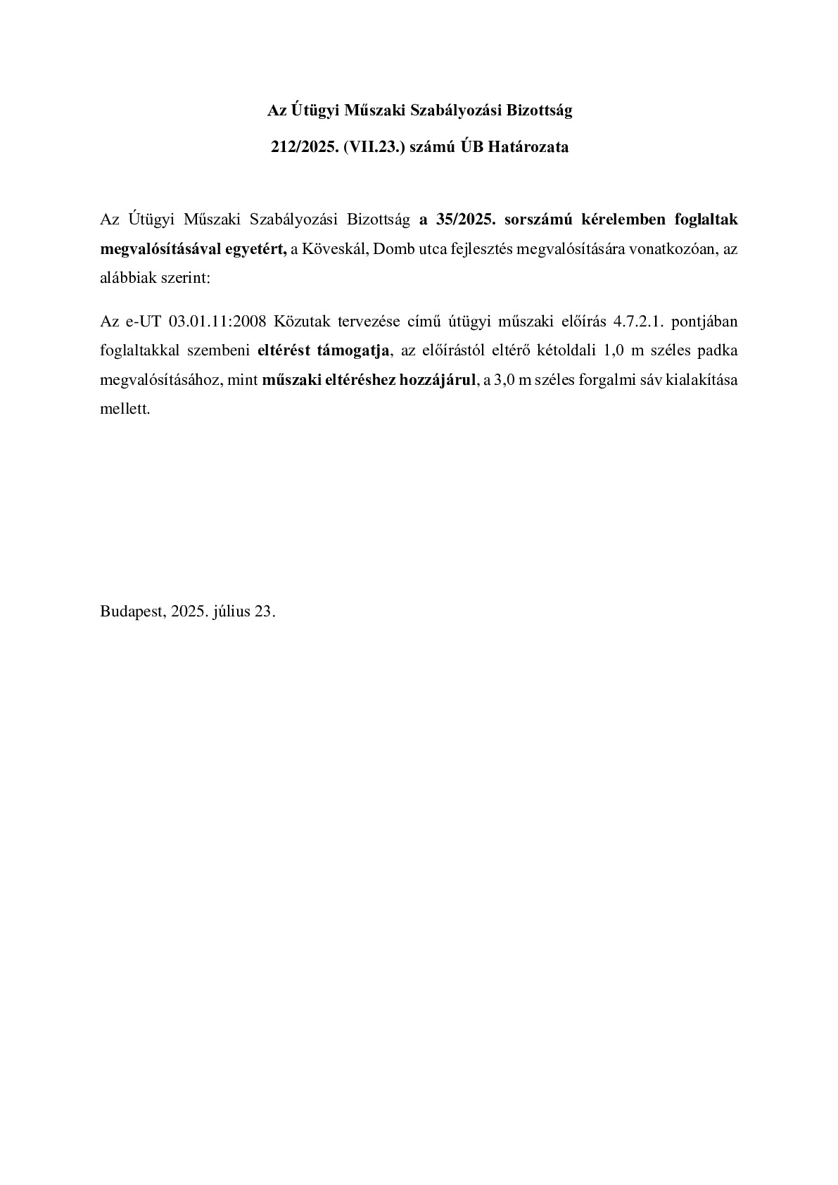 212/2025. (VII.23.) ÚB határozat - Köveskál, Domb utca fejlesztés megvalósítása