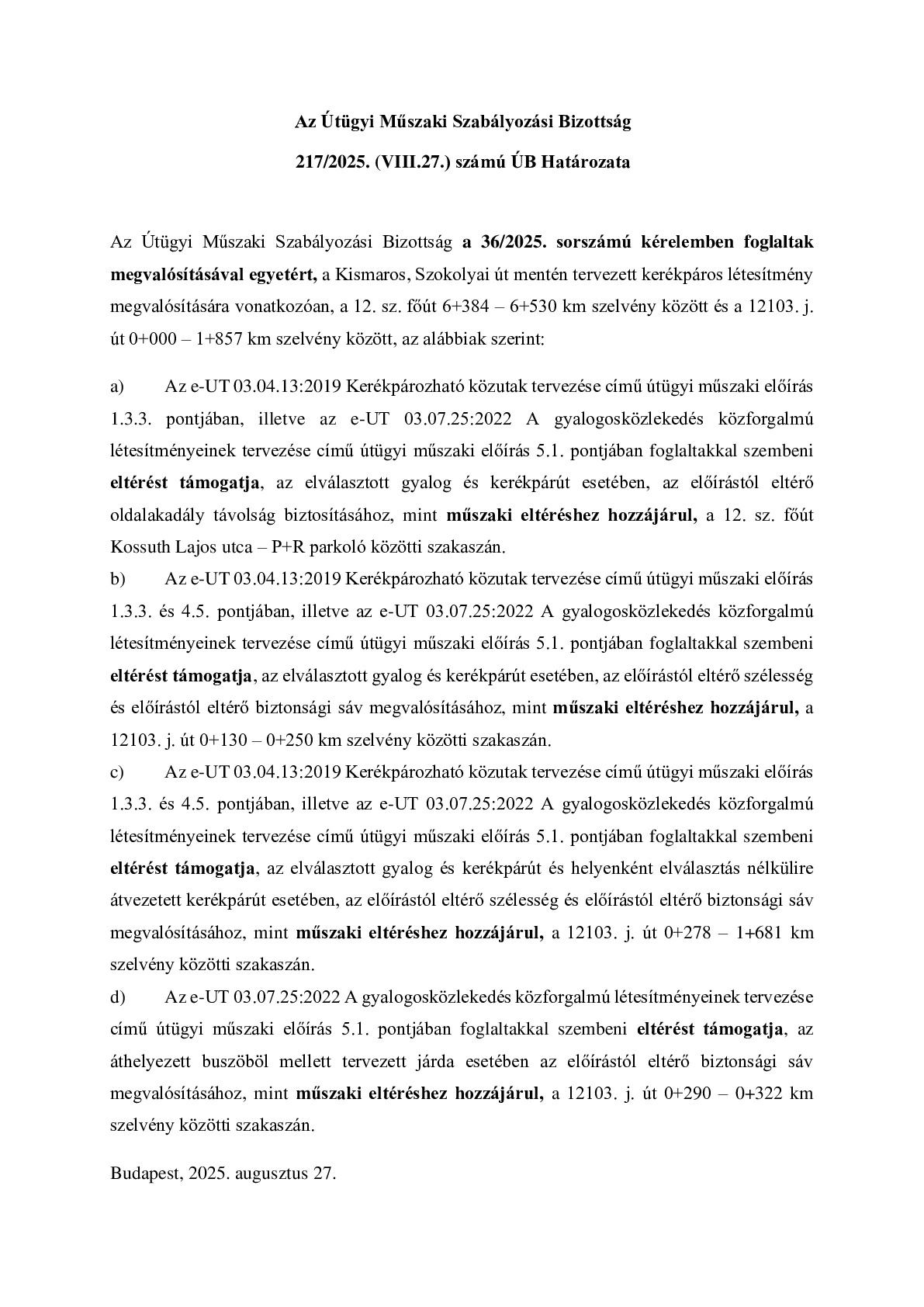 217/2025. (VIII.27.) ÚB határozat - Kismaros, Szokolyai út mentén tervezett kerékpáros létesítmény megvalósítása