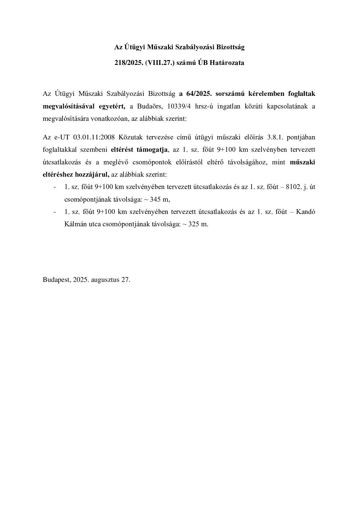 218/2025. (VIII.27.) ÚB határozat - Budaörs, 10339/4 hrsz-ú ingatlan közúti kapcsolatának a megvalósítása