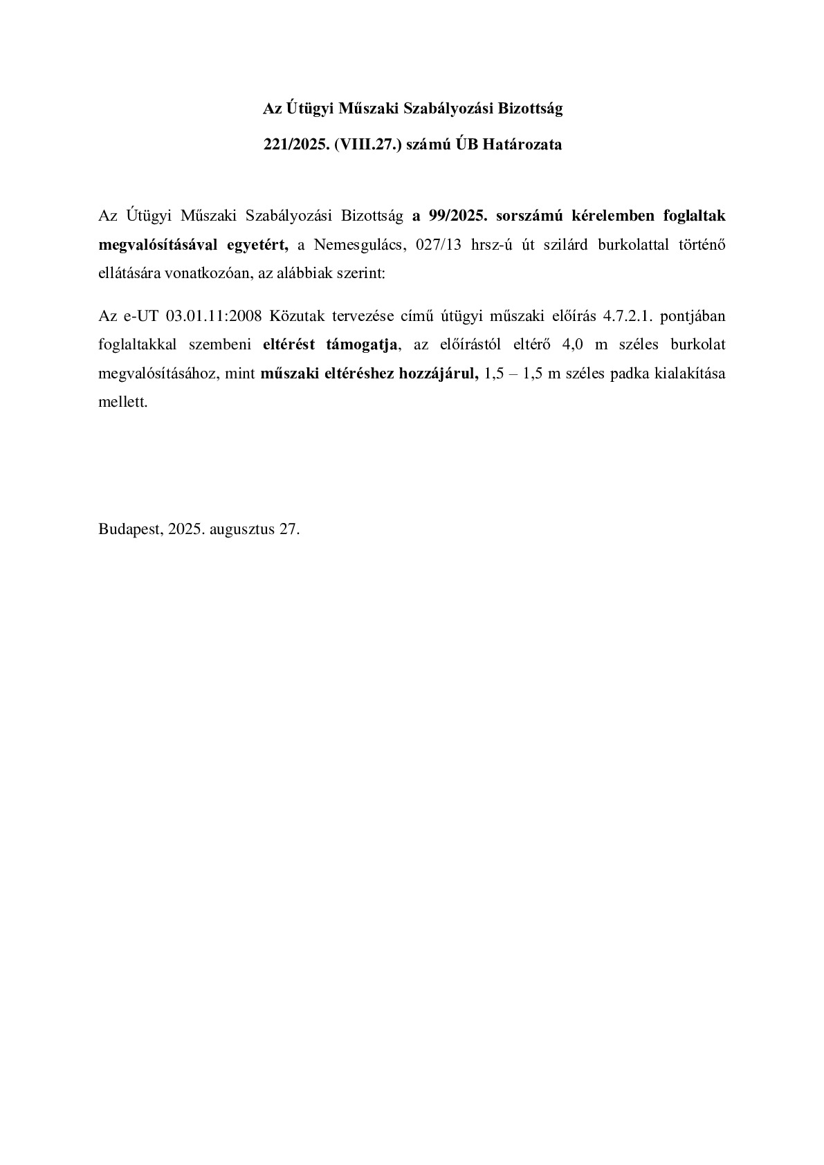 221/2025. (VIII.27.) ÚB határozat - Nemesgulács, 027/13 hrsz-ú út szilárd burkolattal történő ellátása