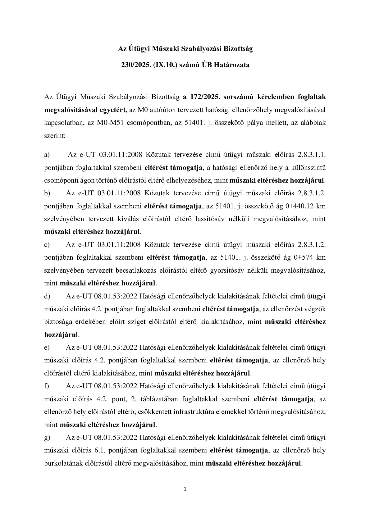 230/2025. (IX.10.) ÚB határozat - M0 autóúton tervezett hatósági ellenőrzőhely megvalósítása, az M0-M51 csomópontban, az 51401. j. összekötő pálya mellett