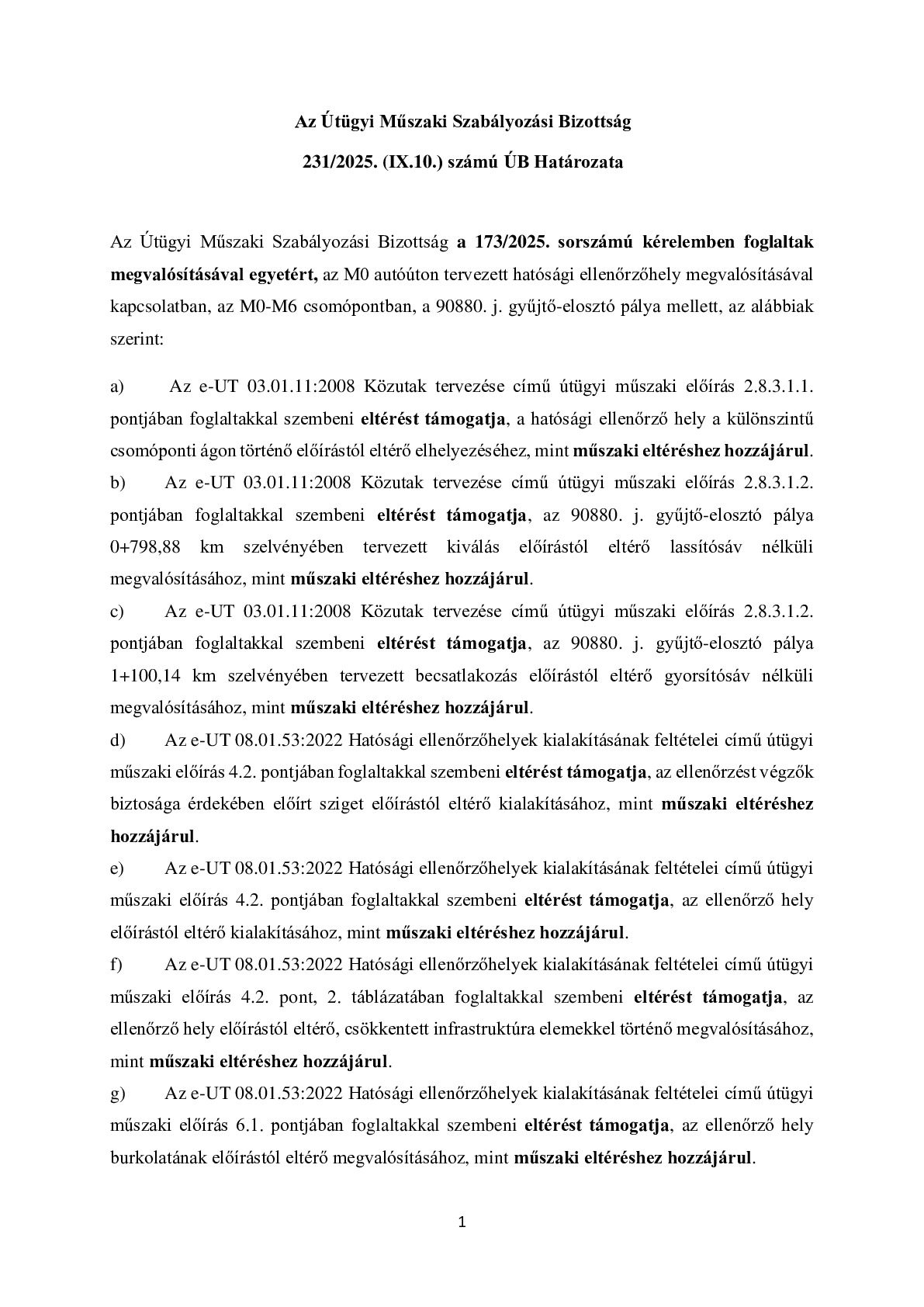 231/2025. (IX.10.) ÚB határozat - M0 autóúton tervezett hatósági ellenőrzőhely megvalósítása, az M0-M6 csomópontban, a 90880. j. gyűjtő-elosztó pálya mellett