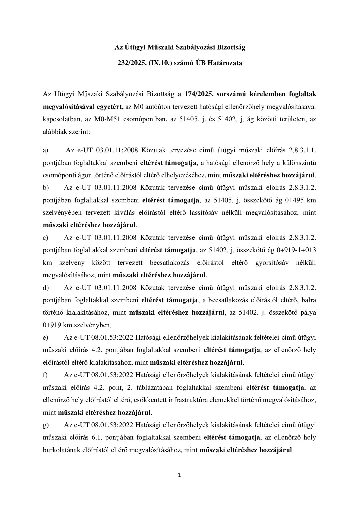 232/2025. (IX.10.) ÚB határozat - M0 autóúton tervezett hatósági ellenőrzőhely megvalósítása, az M0-M51 csomópontban, az 51405. j. és 51402. j. ág közötti területen