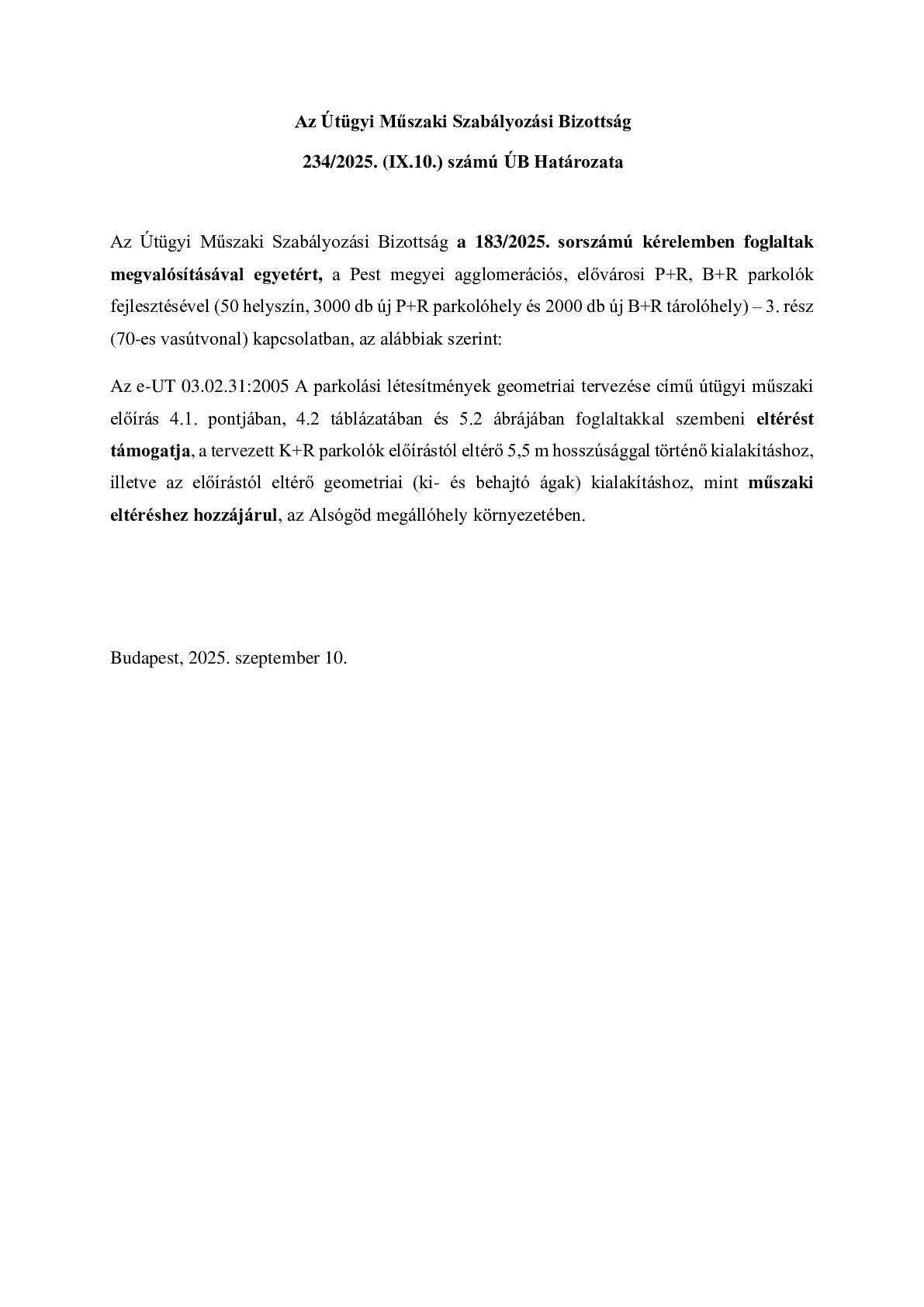 234/2025. (IX.10.) ÚB határozat - Pest megyei agglomerációs, elővárosi P+R, B+R parkolók fejlesztésével (50 helyszín, 3000 db új P+R parkolóhely és 2000 db új B+R tárolóhely) – 3. rész
