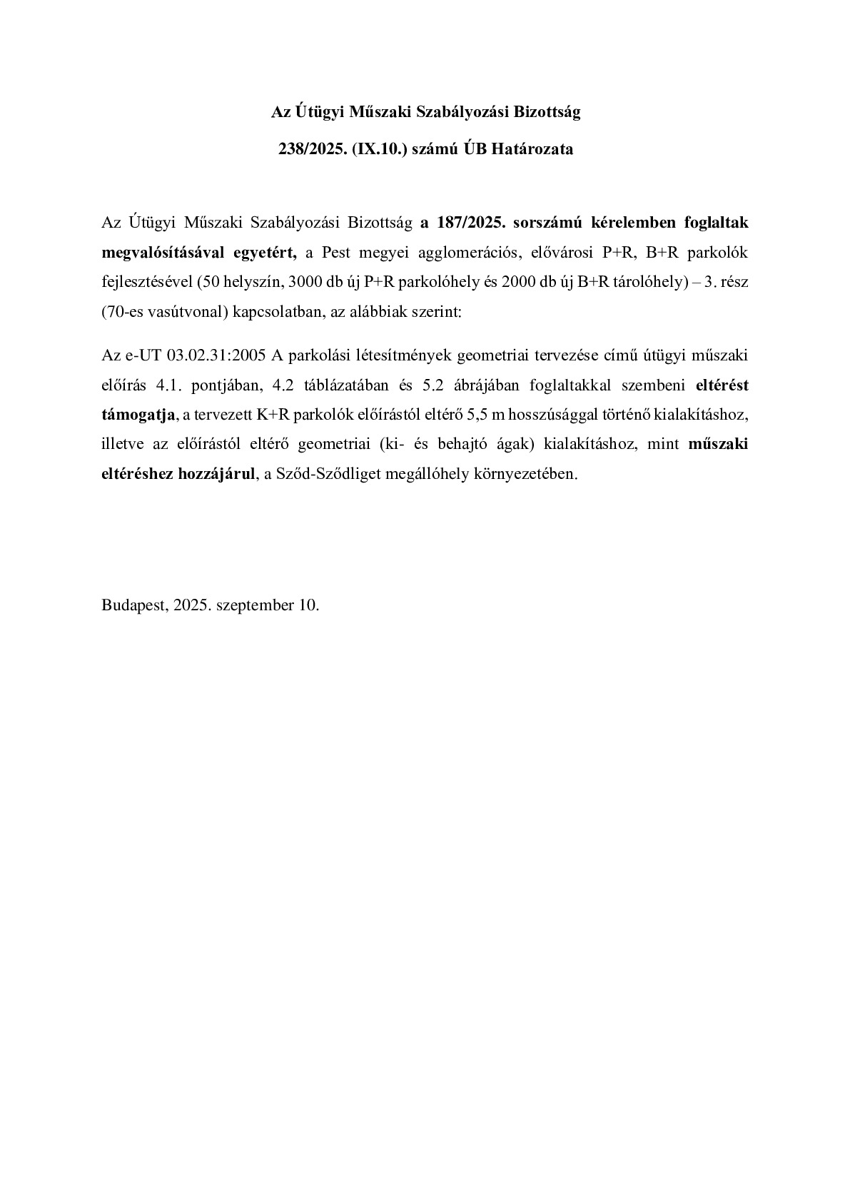 238/2025. (IX.10.) ÚB határozat - Pest megyei agglomerációs, elővárosi P+R, B+R parkolók fejlesztésével (50 helyszín, 3000 db új P+R parkolóhely és 2000 db új B+R tárolóhely) – 3. rész