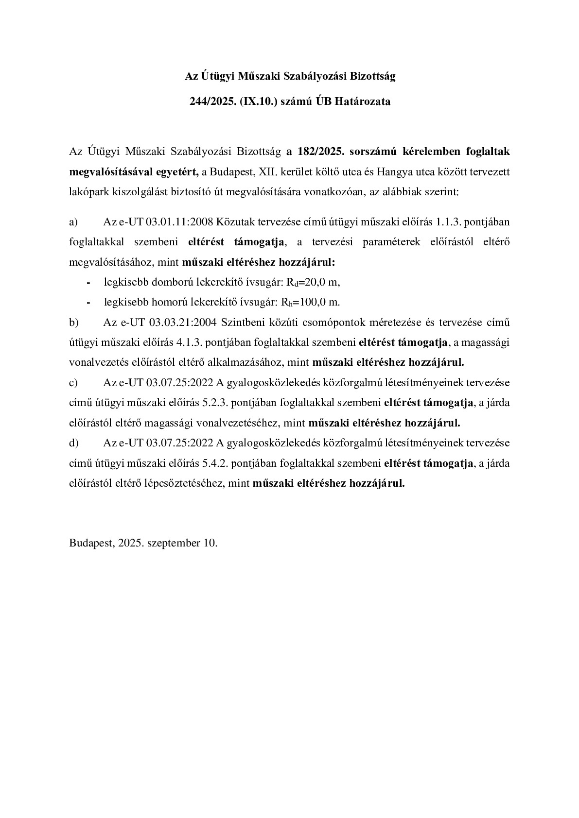 244/2025. (IX.10.) ÚB határozat - Budapest, XII. kerület költő utca és Hangya utca között tervezett lakópark kiszolgálást biztosító út megvalósítása
