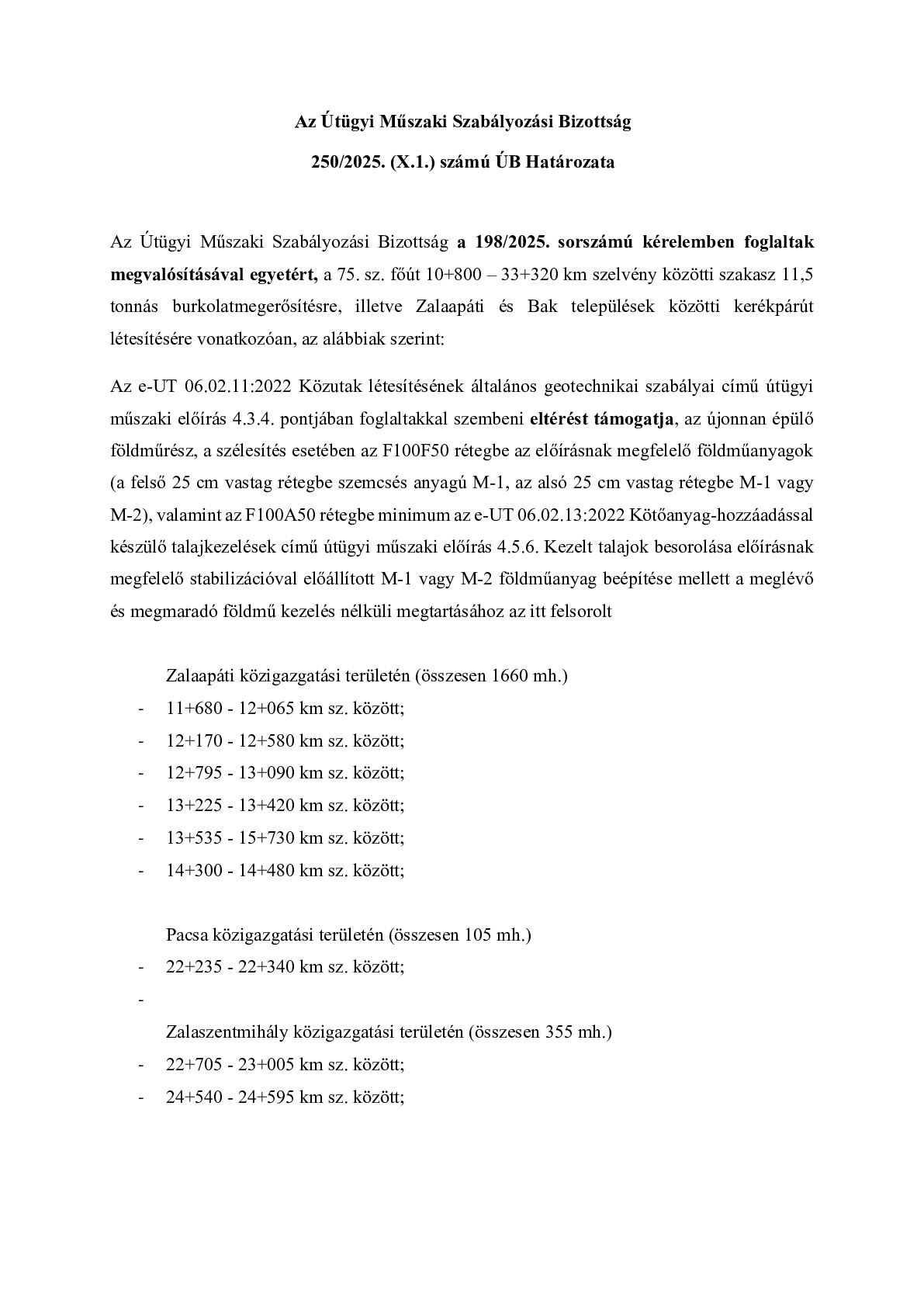 250/2025. (X.1.) ÚB határozat - 75. sz. főút 10+800 – 33+320 km szelvény közötti szakasz 11,5 tonnás burkolatmegerősítésre, illetve Zalaapáti és Bak települések közötti kerékpárút