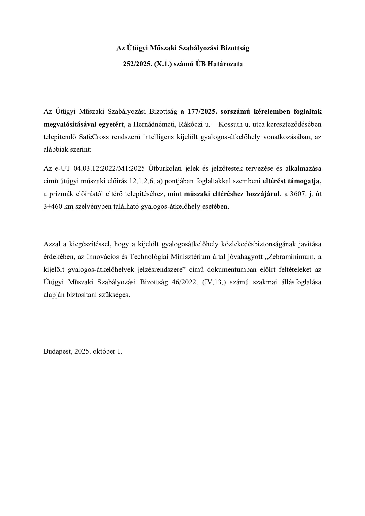252/2025. (X.1.) ÚB határozat - Hernádnémeti, Rákóczi u. – Kossuth u. utca kereszteződésében telepítendő SafeCross rendszerű intelligens kijelölt gyalogos-átkelőhely