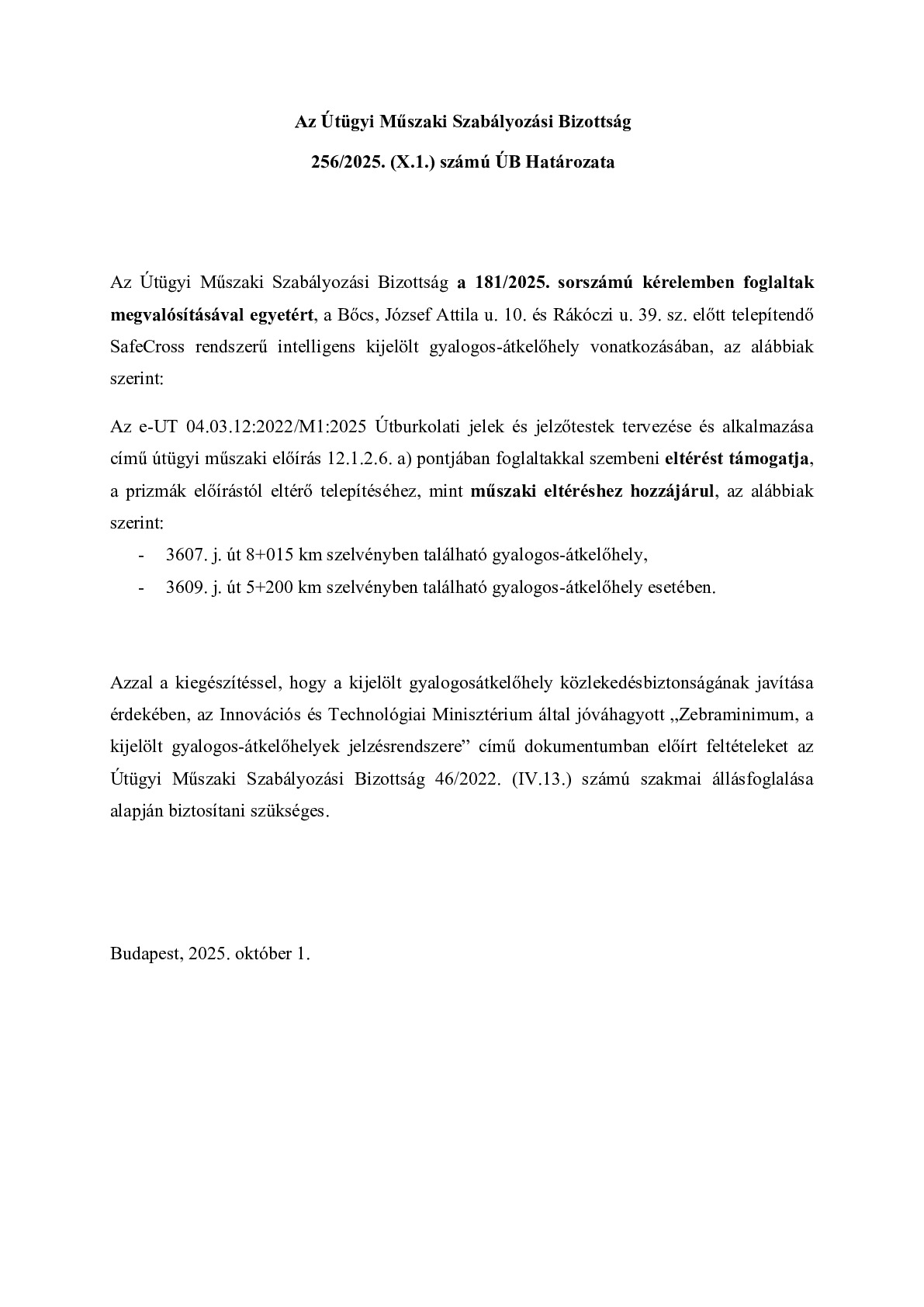 256/2025. (X.1.) ÚB határozat - Bőcs, József Attila u. 10. és Rákóczi u. 39. sz. előtt telepítendő SafeCross rendszerű intelligens kijelölt gyalogos-átkelőhely