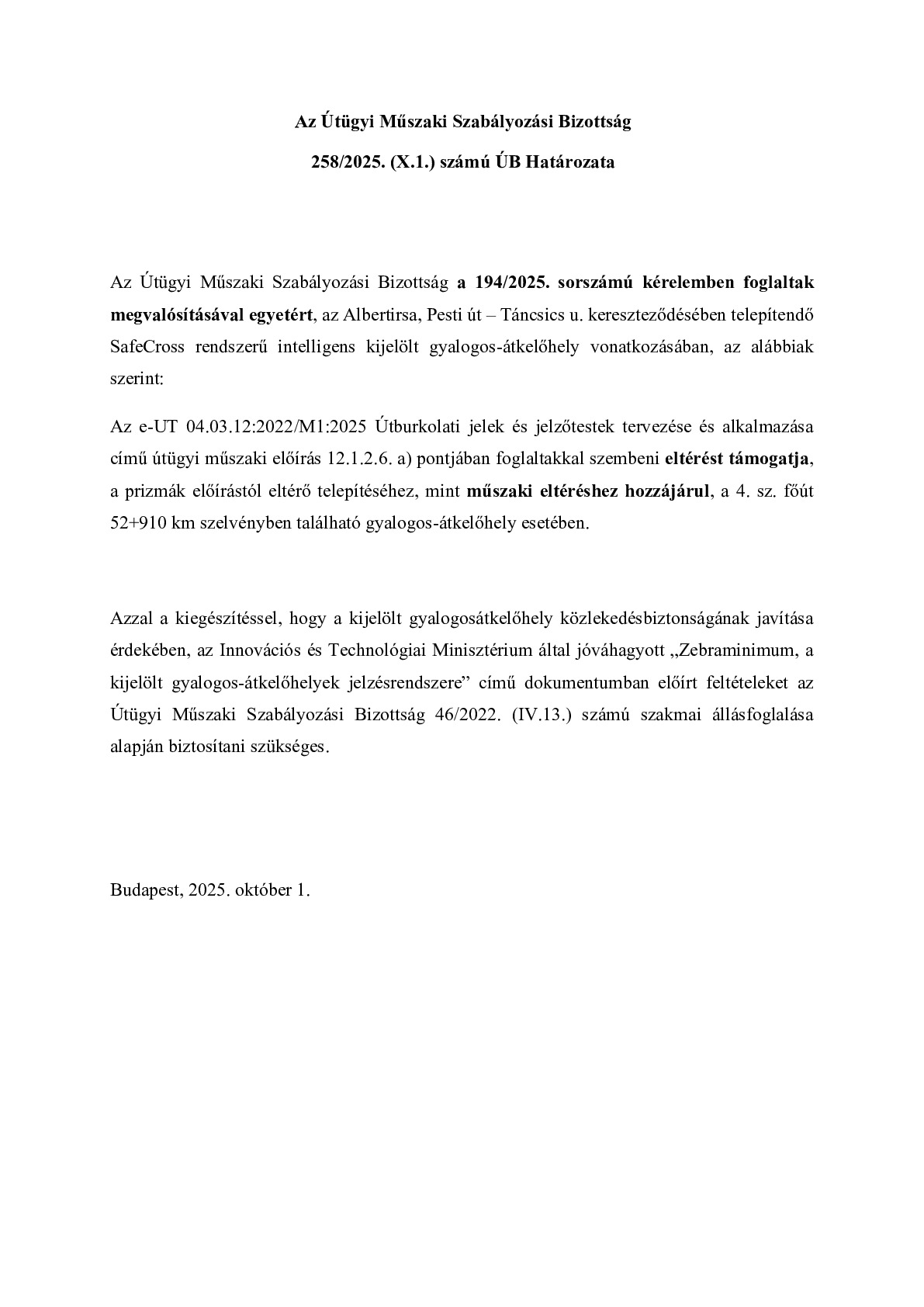 258/2025. (X.1.) ÚB határozat - Albertirsa, Pesti út – Táncsics u. kereszteződésében telepítendő SafeCross rendszerű intelligens kijelölt gyalogos-átkelőhely