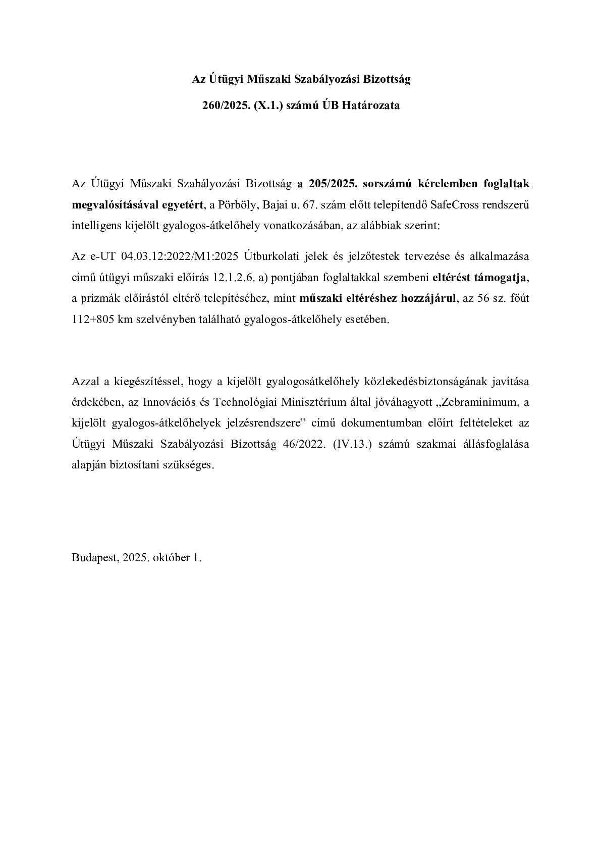 260/2025. (X.1.) ÚB határozat - Pörböly, Bajai u. 67. szám előtt telepítendő SafeCross rendszerű intelligens kijelölt gyalogos-átkelőhely