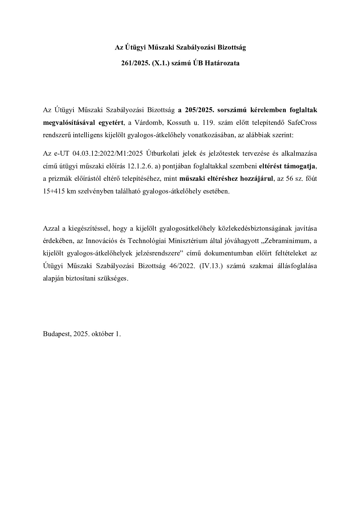 261/2025. (X.1.) ÚB határozat - Várdomb, Kossuth u. 119. szám előtt telepítendő SafeCross rendszerű intelligens kijelölt gyalogos-átkelőhely