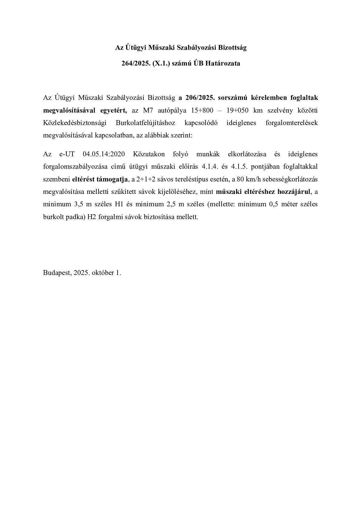 264/2025. (X.1.) ÚB határozat - M7 autópálya 15+800 – 19+050 km szelvény közötti Közlekedésbiztonsági Burkolatfelújításhoz kapcsolódó ideiglenes forgalomterelés