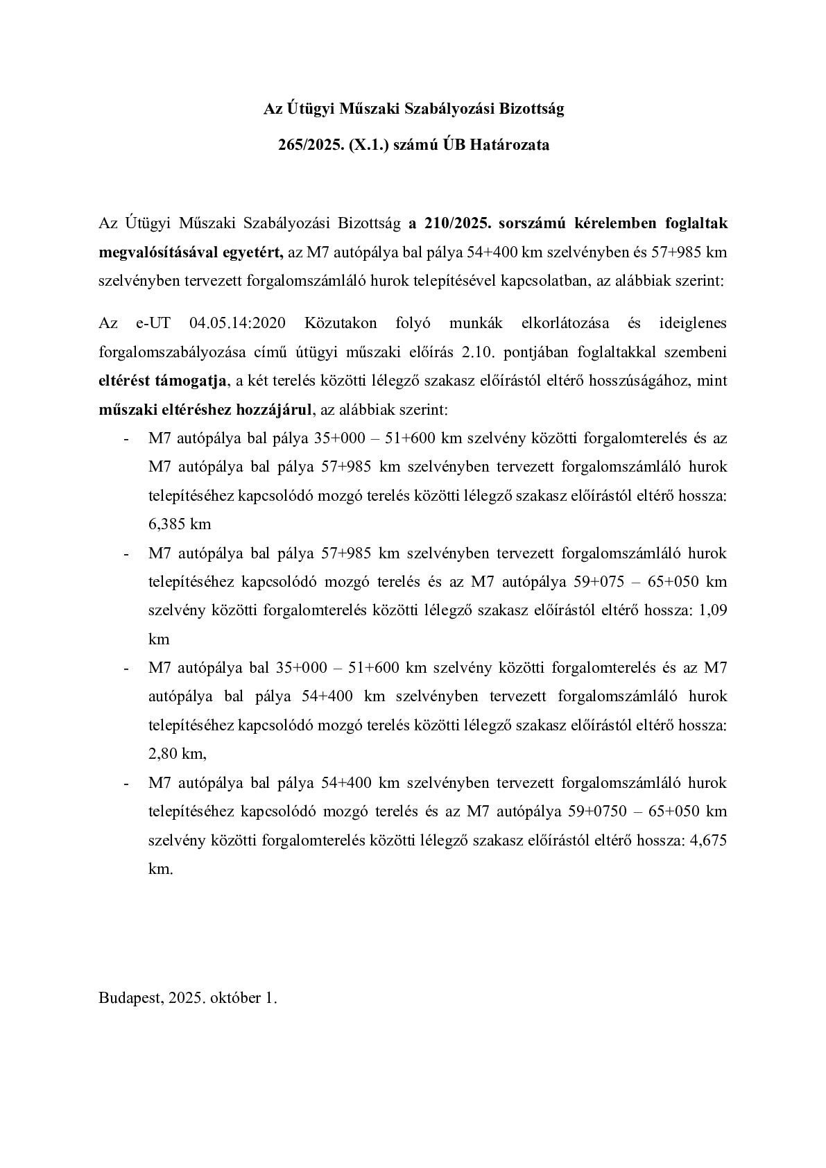 265/2025. (X.1.) ÚB határozat - M7 autópálya bal pálya 54+400 km szelvényben és 57+985 km szelvényben tervezett forgalomszámláló hurok telepítése