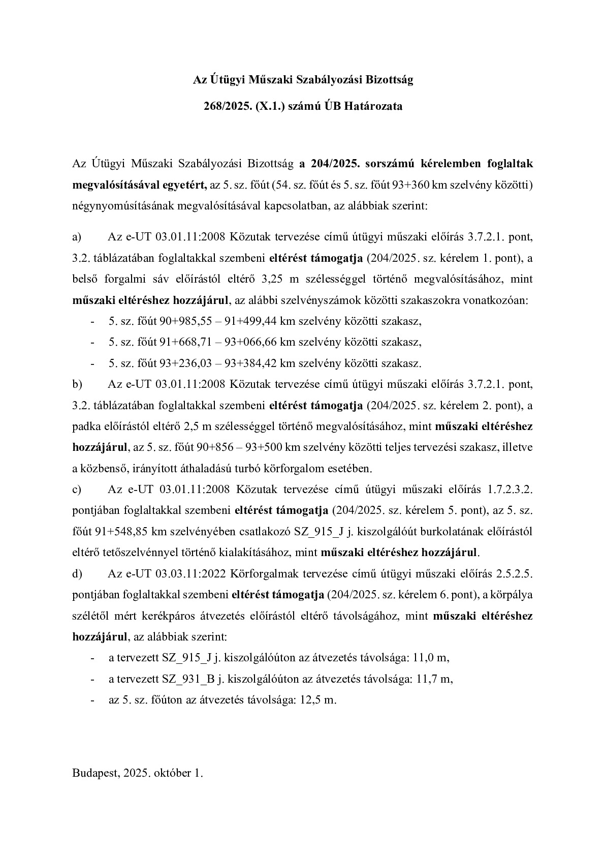 268/2025. (X.1.) ÚB határozat - 5. sz. főút (54. sz. főút és 5. sz. főút 93+360 km szelvény közötti) négynyomúsításának megvalósítása