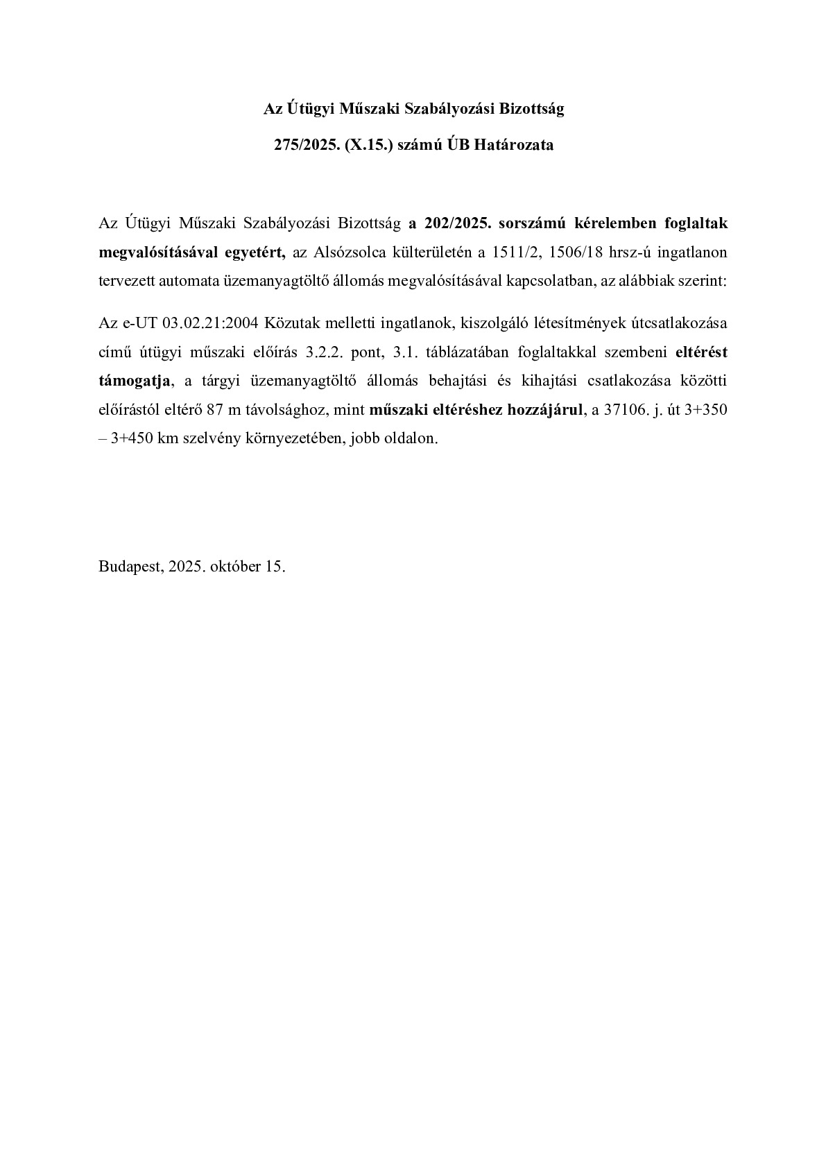 275/2025. (X.15.) ÚB határozat - Alsózsolca külterületén a 1511/2, 1506/18 hrsz-ú ingatlanon tervezett automata üzemanyagtöltő állomás közúti kapcsolata