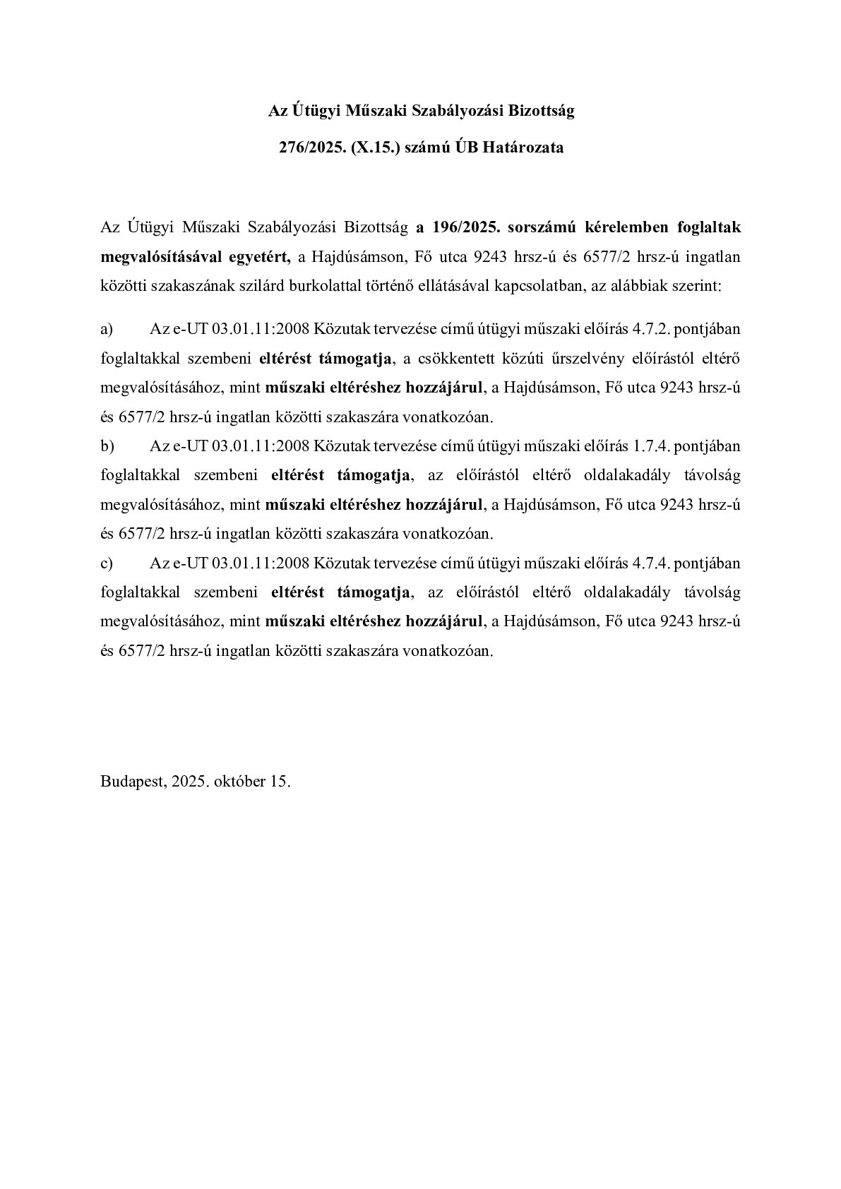 276/2025. (X.15.) ÚB határozat - Hajdúsámson, Fő utca 9243 hrsz-ú és 6577/2 hrsz-ú ingatlan közötti szakaszának szilárd burkolattal történő ellátása