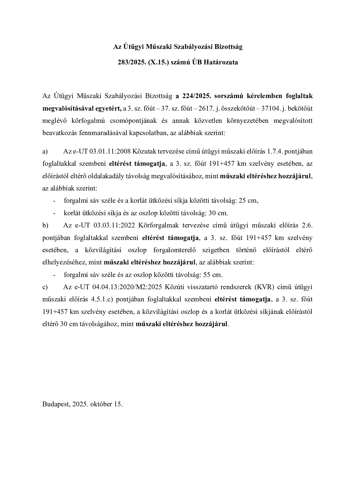 283/2025. (X.15.) ÚB határozat - 3. sz. főút – 37. sz. főút – 2617. j. összekötőút – 37104. j. bekötőút meglévő körfogalmú csomópontjának és annak közvetlen környezetében megvalósított beavatkozás fennmaradásával kapcsolatban