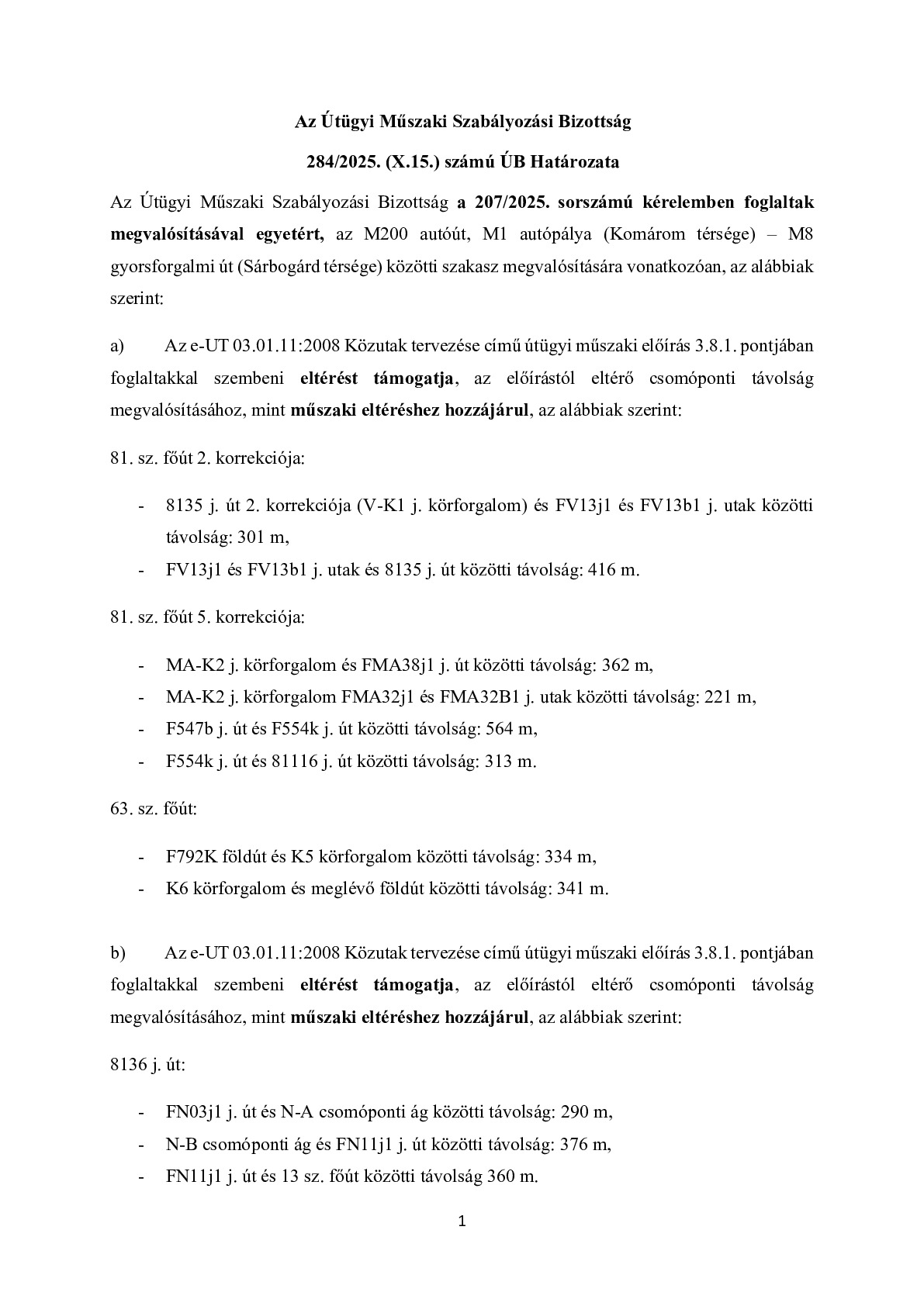 284/2025. (X.15.) ÚB határozat - M200 autóút, M1 autópálya (Komárom térsége) – M8 gyorsforgalmi út (Sárbogárd térsége) közötti szakasz megvalósítása