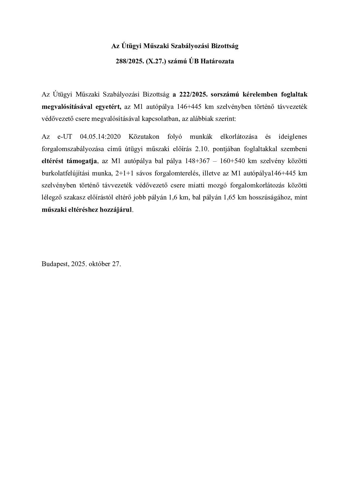 288/2025. (X.27.) ÚB határozat - M1 autópálya 146+445 km szelvényben történő távvezeték védővezető csere megvalósítása