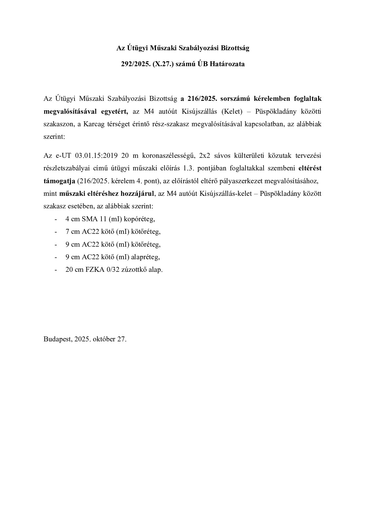 292/2025. (X.27.) ÚB határozat - M4 autóút Kisújszállás (Kelet) – Püspökladány közötti szakaszon, a Karcag térséget érintő rész-szakasz megvalósítása