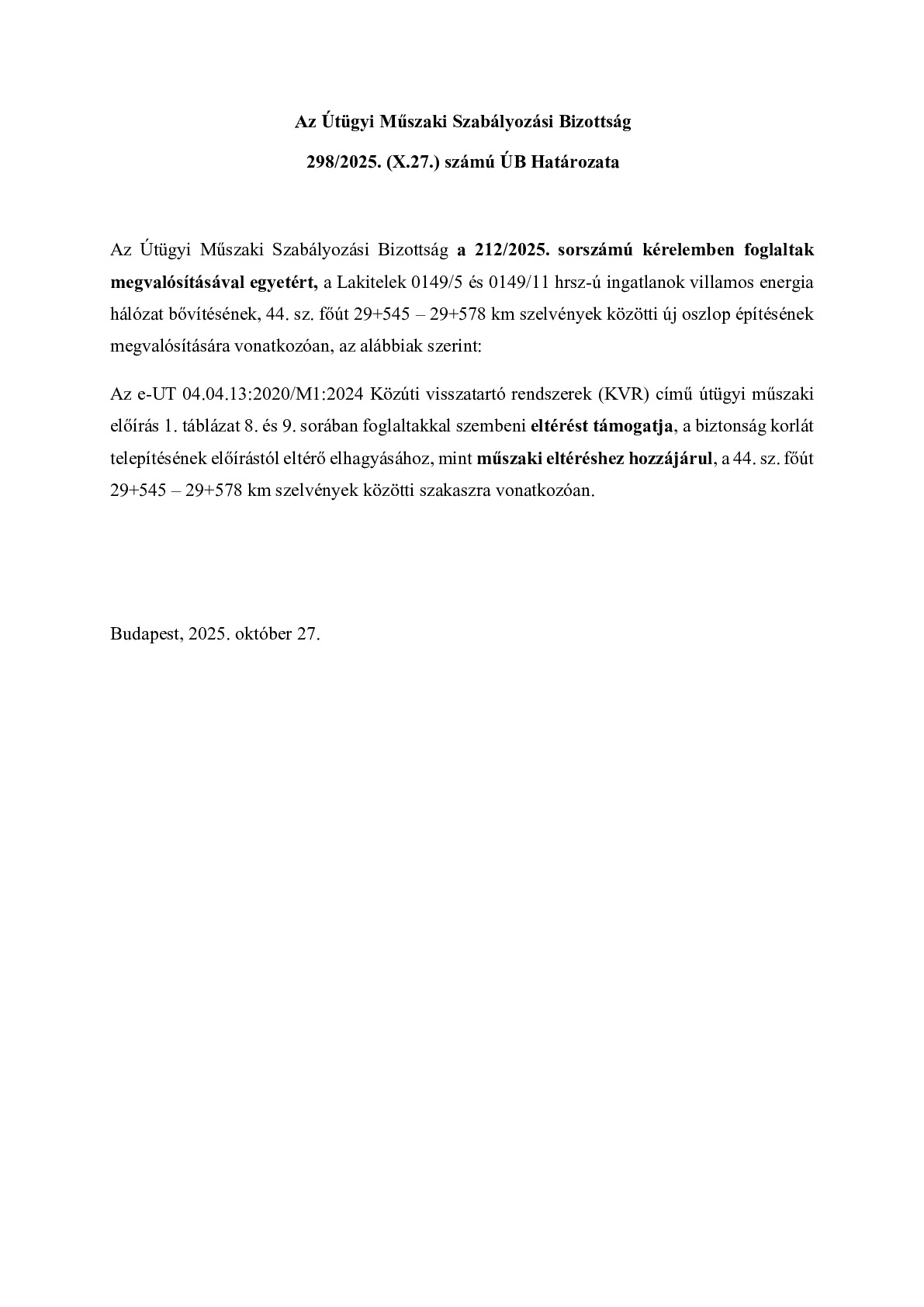 298/2025. (X.27.) ÚB határozat - Lakitelek 0149/5 és 0149/11 hrsz-ú ingatlanok villamos energia hálózat bővítésének, 44. sz. főút 29+545 – 29+578 km szelvények közötti új oszlop építése