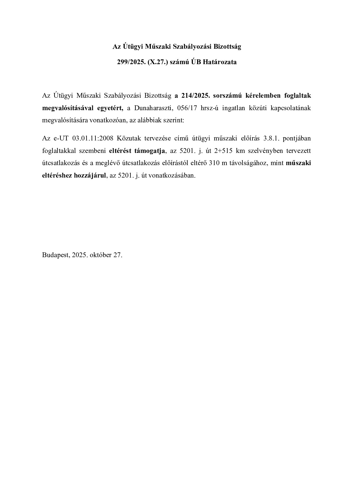 299/2025. (X.27.) ÚB határozat - Dunaharaszti, 056/17 hrsz-ú ingatlan közúti kapcsolatának megvalósítása