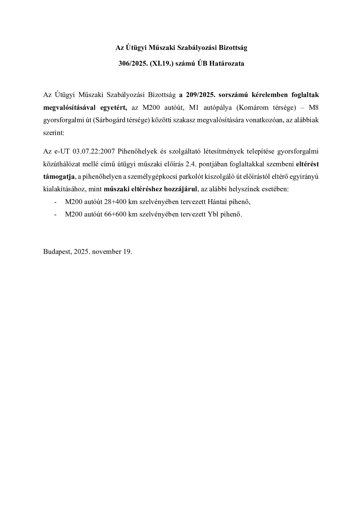 306/2025. (XI.19.) ÚB határozat - M200 autóút, M1 autópálya (Komárom térsége) – M8 gyorsforgalmi út (Sárbogárd térsége) közötti szakasz megvalósítása