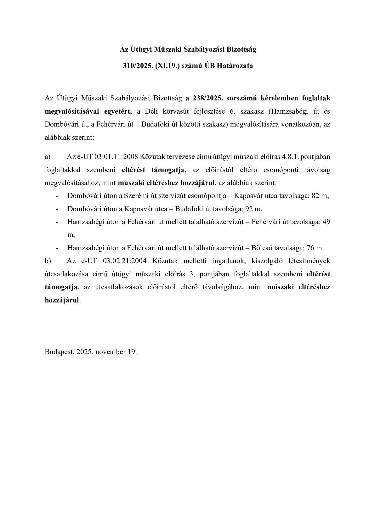 310/2025. (XI.19.) ÚB határozat - Déli körvasút fejlesztése 6. szakasz (Hamzsabégi út és Dombóvári út, a Fehérvári út – Budafoki út közötti szakasz) megvalósítása