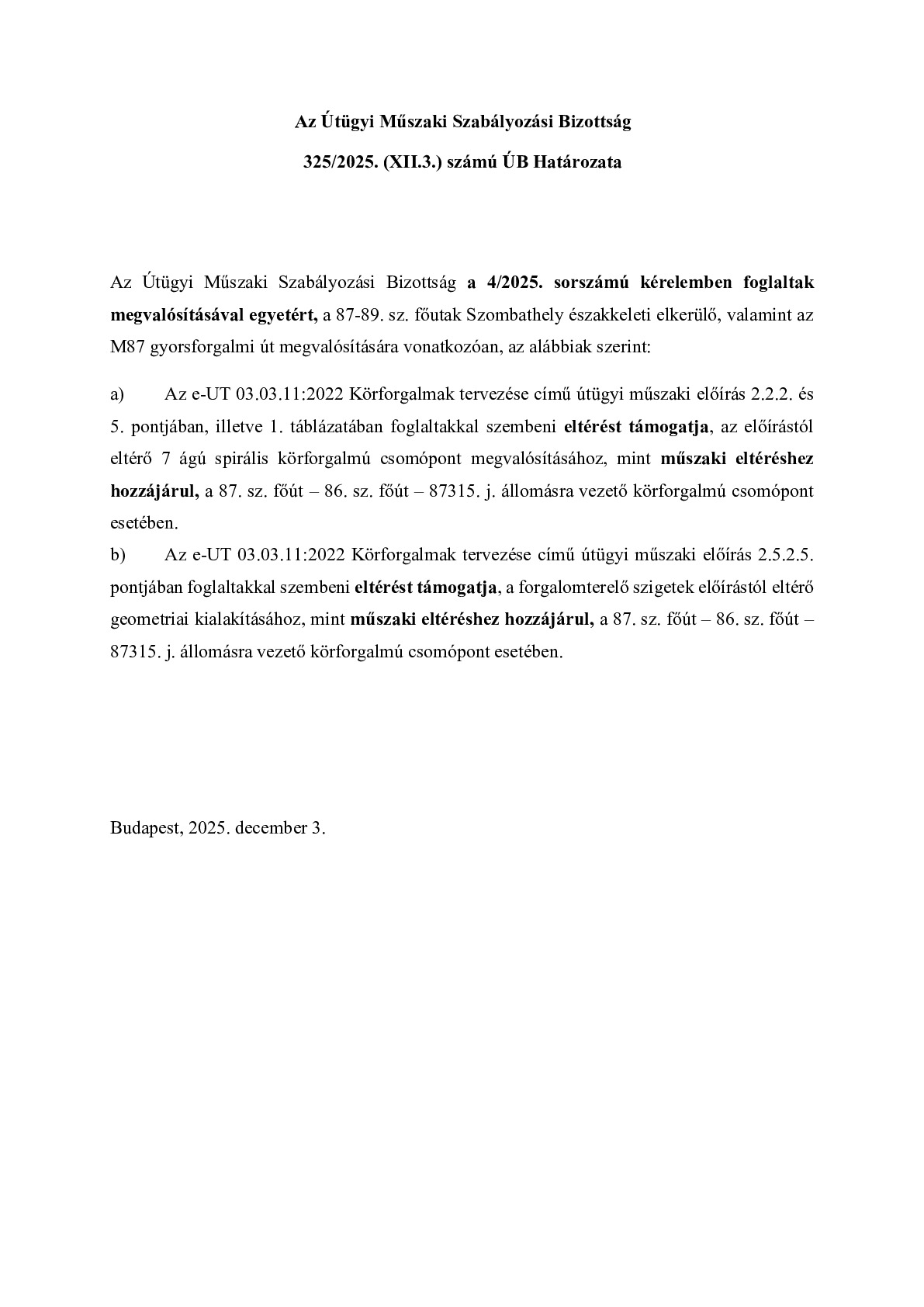 325/2025. (XII.3.) ÚB határozat - 87-89. sz. főutak Szombathely északkeleti elkerülő, valamint az M87 gyorsforgalmi út megvalósítása