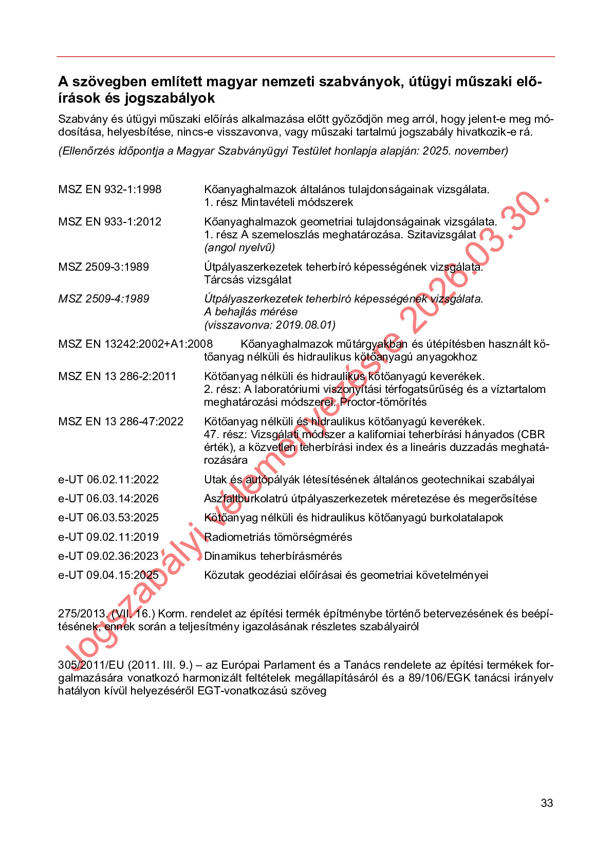 Érvényben lévő útügyi műszaki előírások