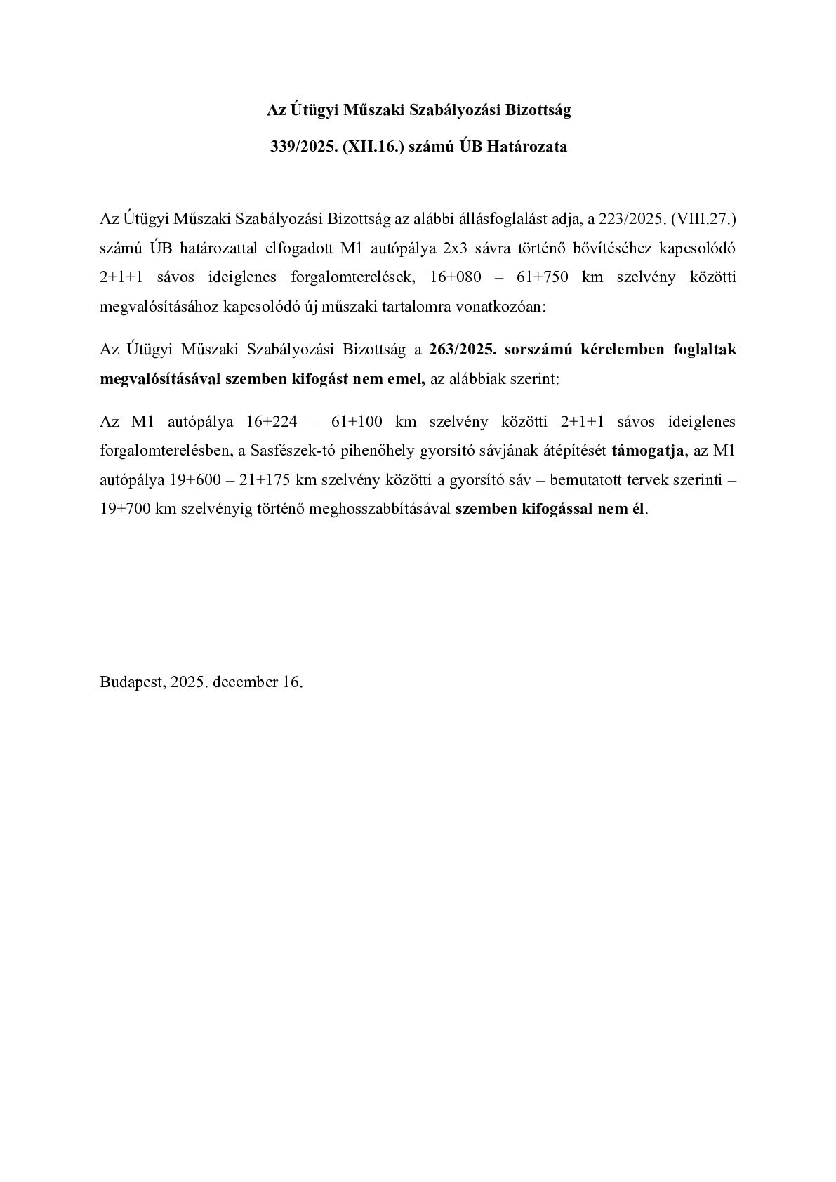 339/2025. (XII.16.) ÚB határozat- M1 autópálya 2x3 sávra történő bővítéséhez kapcsolódó 2+1+1 sávos ideiglenes forgalomterelések, 16+080 – 61+750 km szelvény közötti megvalósításához