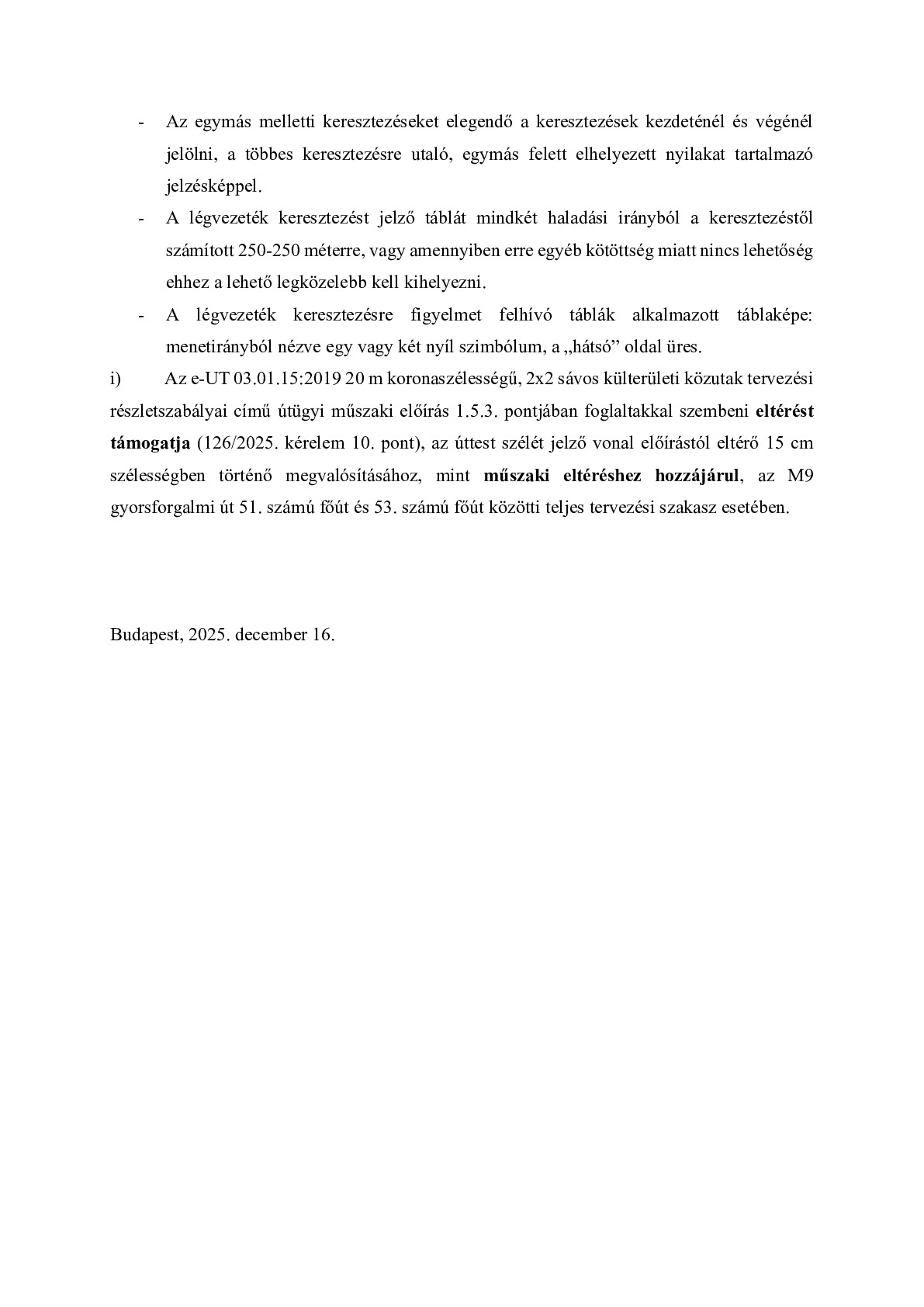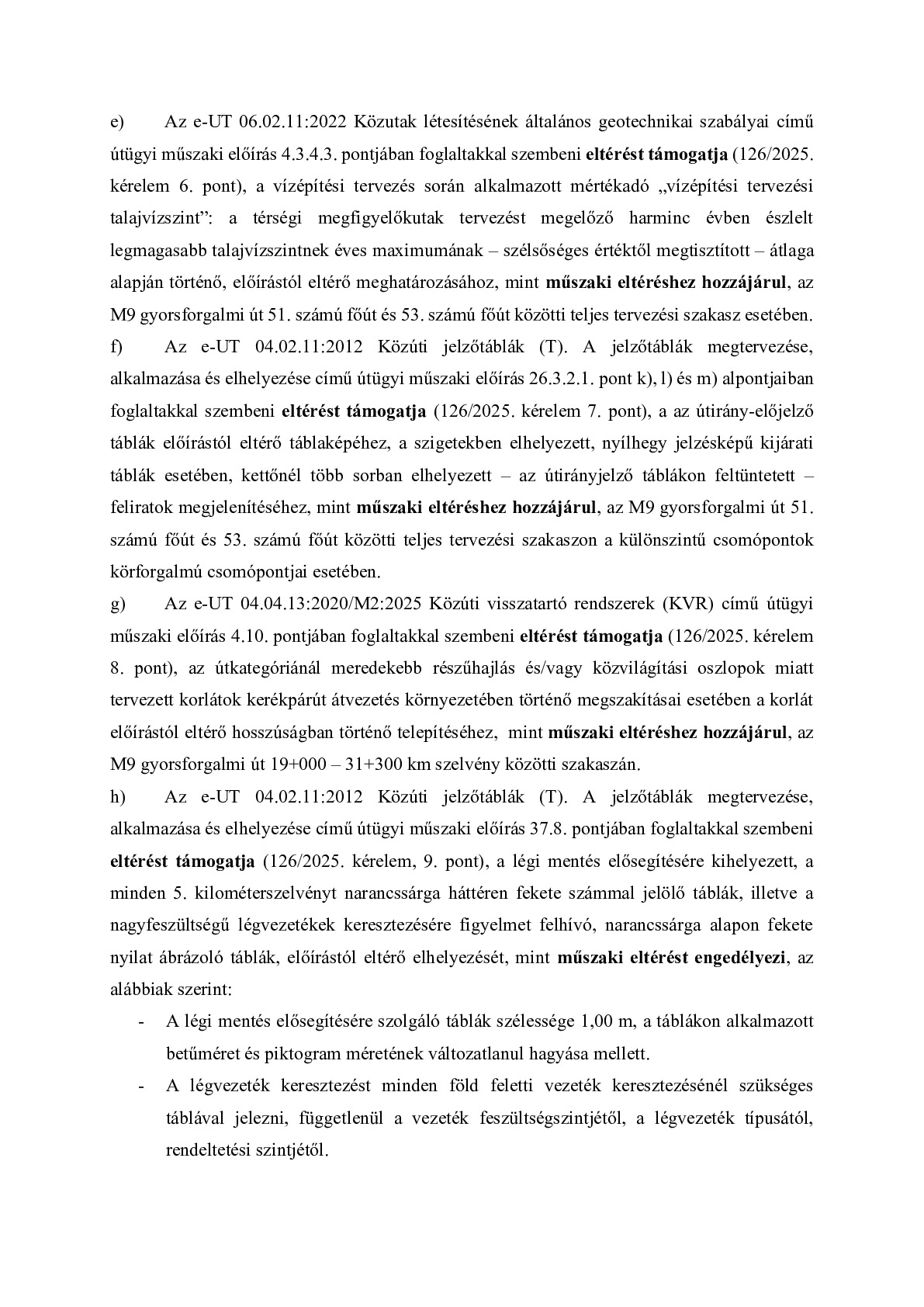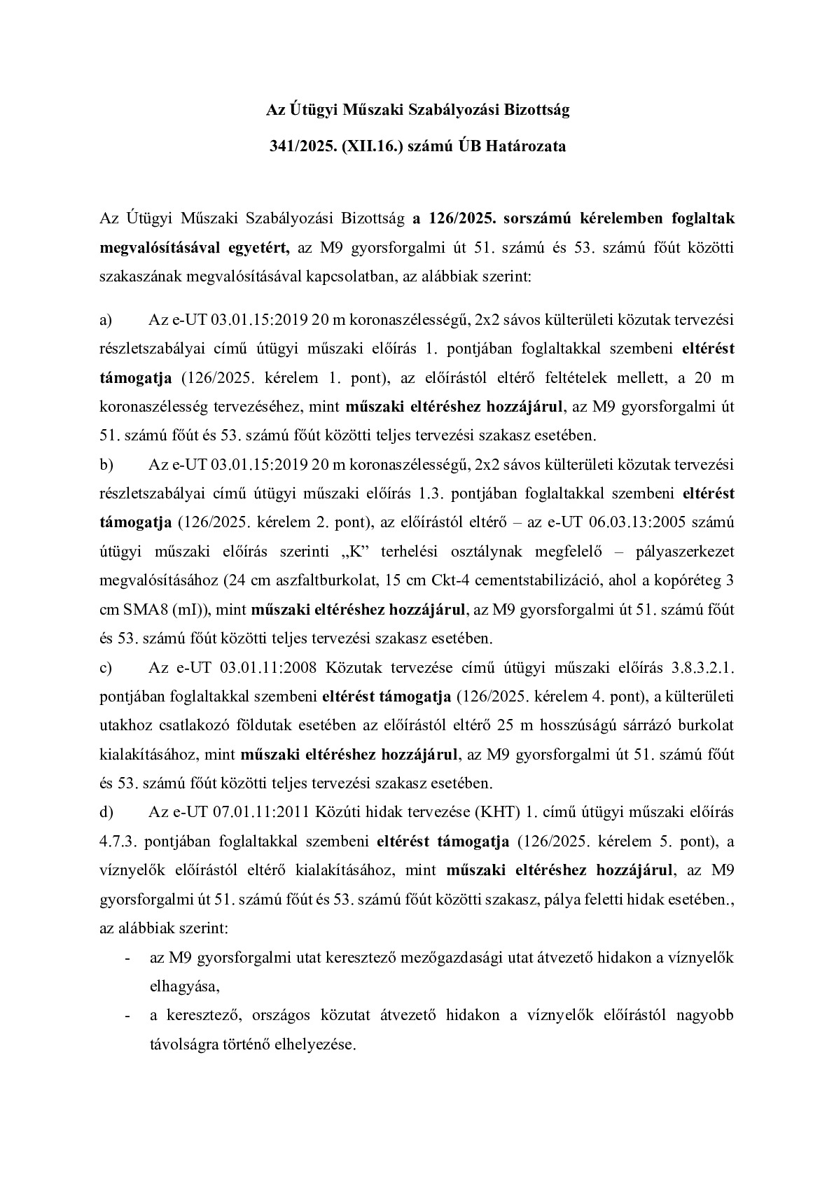 e-UT 03.01.15:2019 20 m koronaszélességű, 2x2 sávos külterületi közutak tervezési részletszabályai, e-UT 03.01.11:2008 Közutak tervezése, e-UT 07.01.11:2011 Közúti hidak tervezése (KHT) 1., e-UT 06.02.11:2022 Közutak létesítésének általános geotechnikai szabályai, e-UT 04.02.11:2012 Közúti jelzőtáblák (T). A jelzőtáblák megtervezése, alkalmazása és elhelyezése, e-UT 04.04.13:2020/M2:2025 Közúti visszatartó rendszerek (KVR)