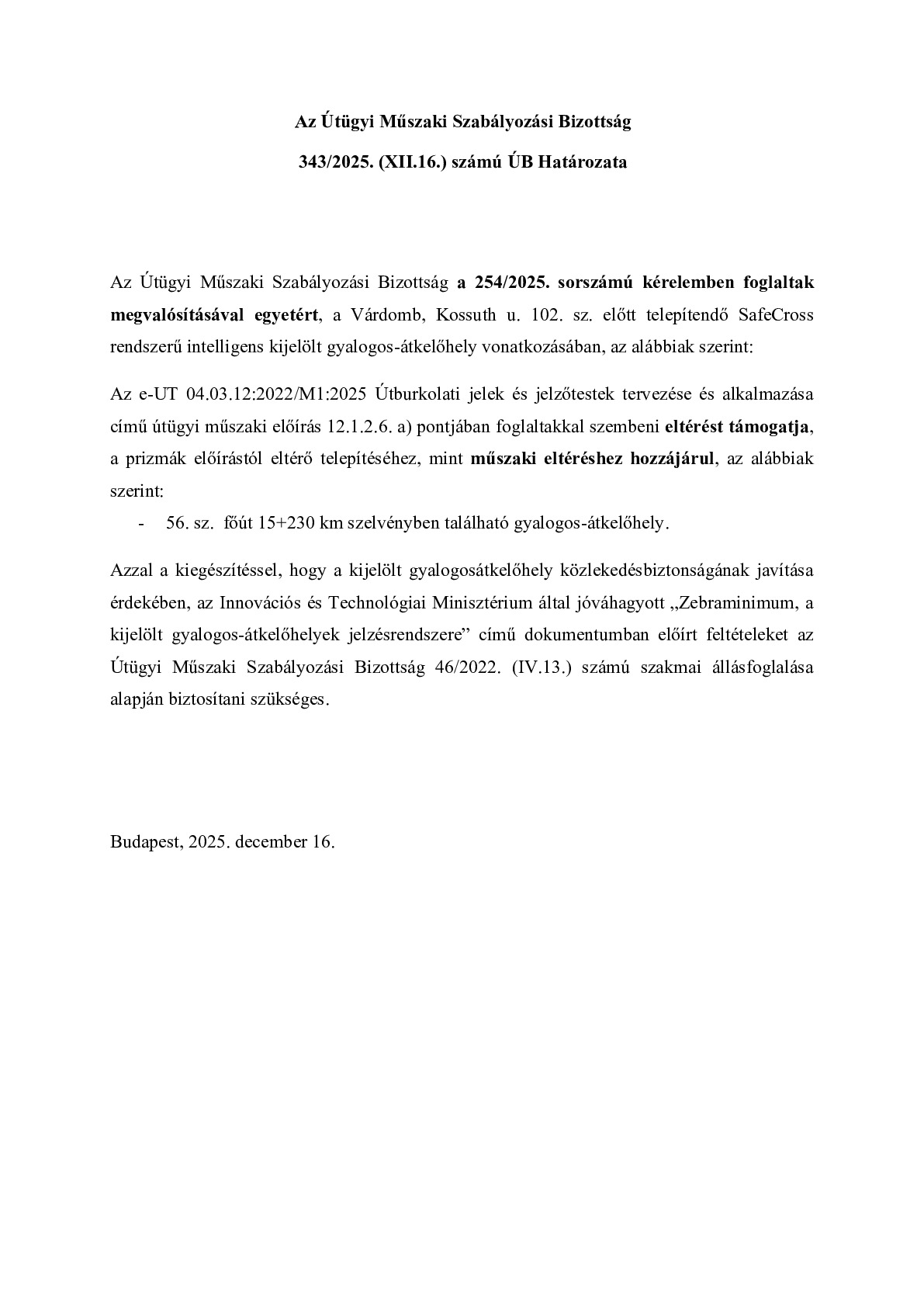 343/2025. (XII.16.) ÚB határozat - Várdomb, Kossuth u. 102. sz. előtt telepítendő SafeCross rendszerű intelligens kijelölt gyalogos-átkelőhely megvalósítása