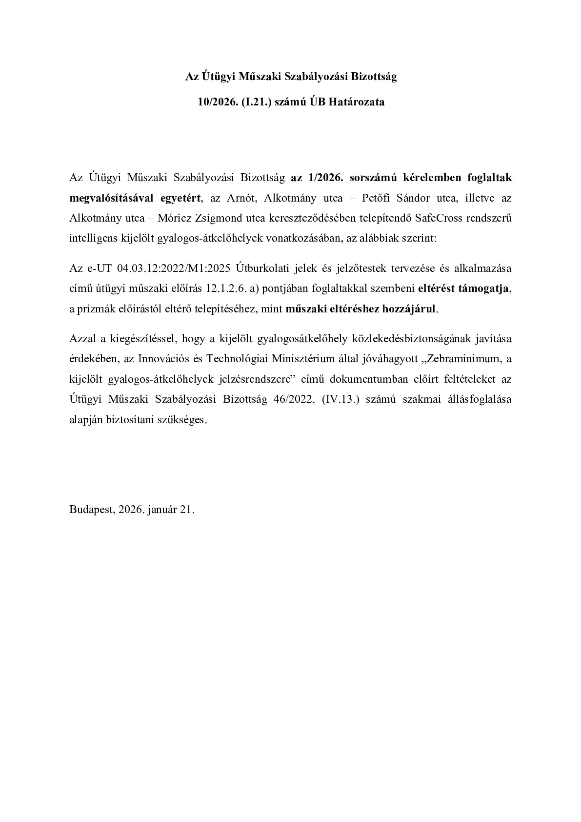10/2026. (I.21.) ÚB határozat - Arnót, Alkotmány utca – Petőfi Sándor utca, illetve az Alkotmány utca – Móricz Zsigmond utca kereszteződésében telepítendő SafeCross rendszerű intelligens kijelölt gyalogos-átkelőhelyek megvalósítása