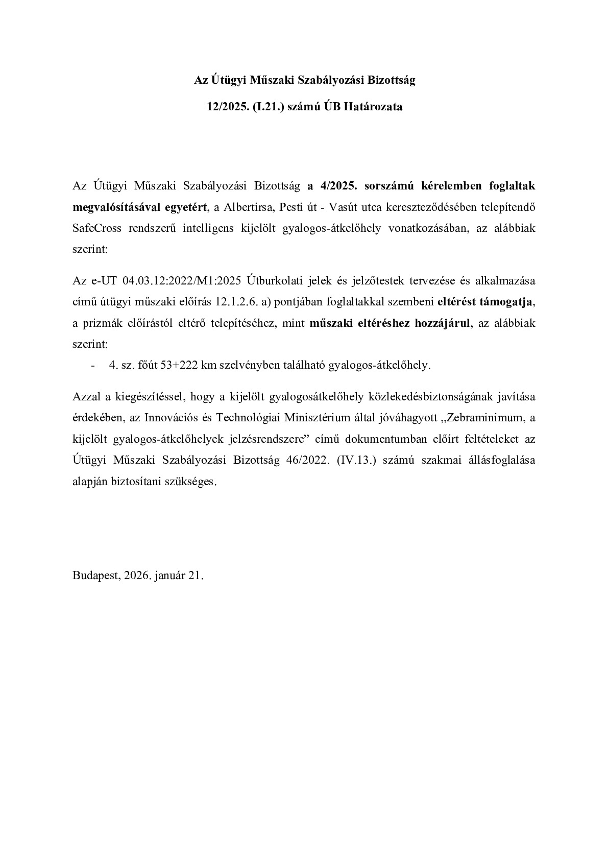 12/2026. (I.21.) ÚB határozat - Albertirsa, Pesti út - Vasút utca kereszteződésében telepítendő SafeCross rendszerű intelligens kijelölt gyalogos-átkelőhely megvalósítása