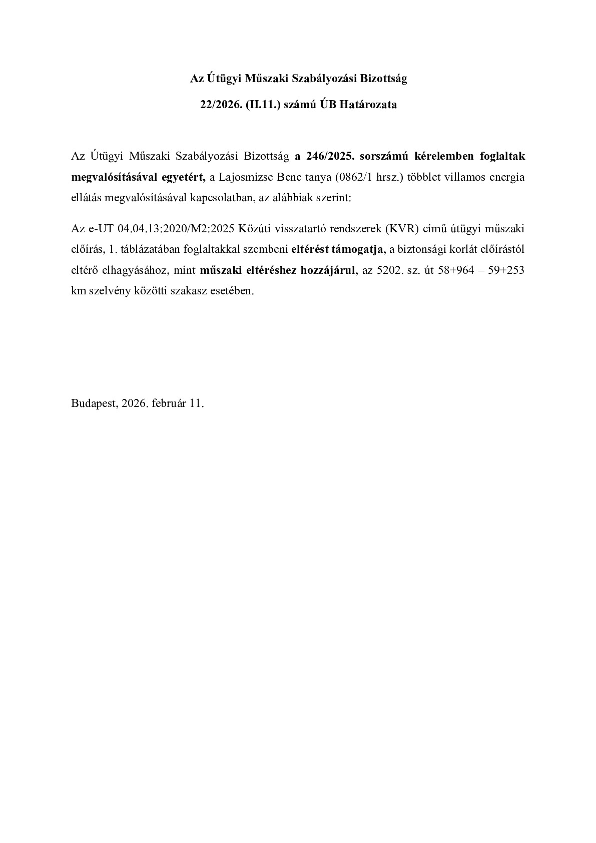 22/2026. (II.11.) ÚB határozat - Lajosmizse Bene tanya (0862/1 hrsz.) többlet villamos energia ellátás megvalósítása