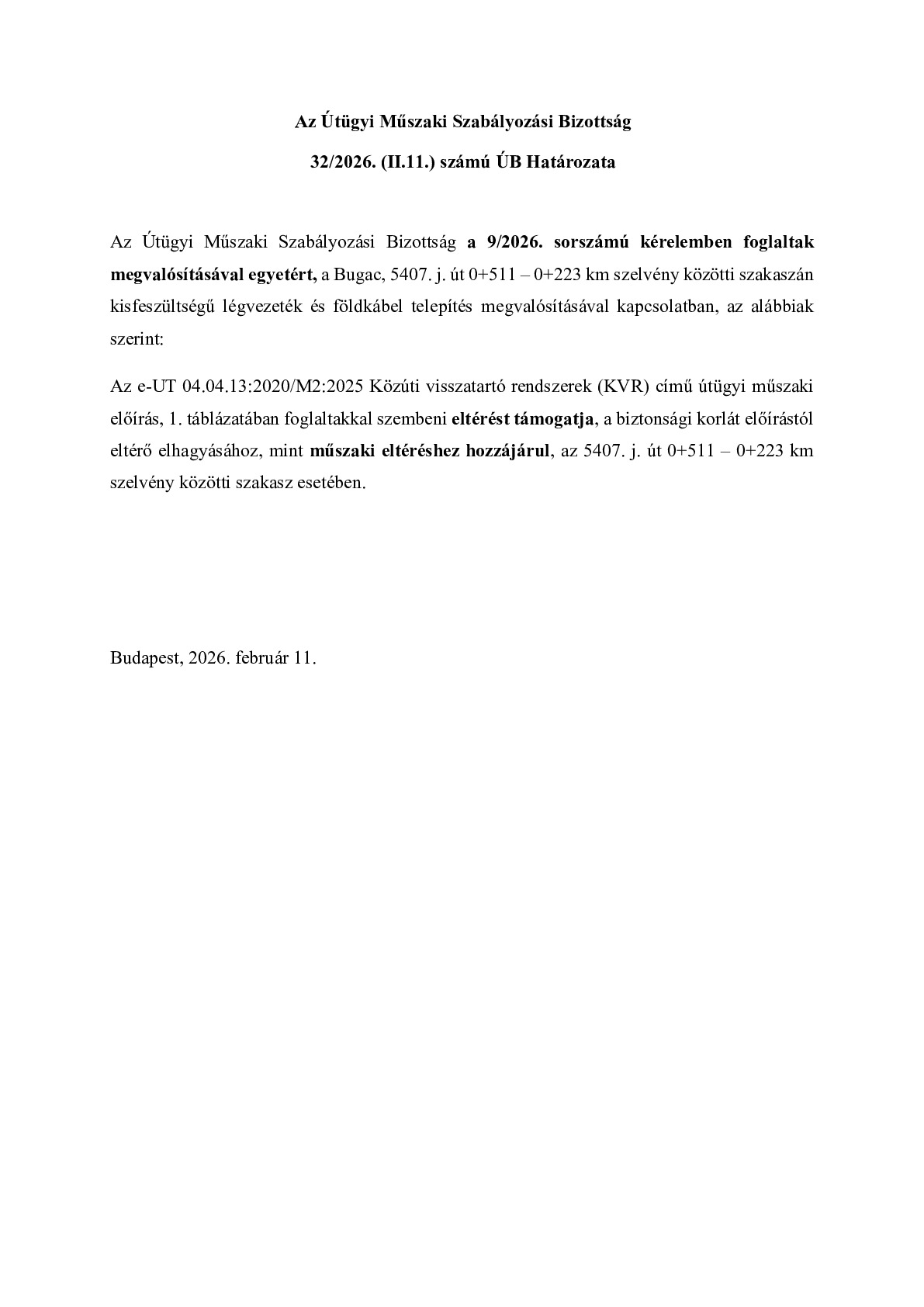 32/2026. (II.11.) ÚB határozat - Bugac, 5407. j. út 0+511 – 0+223 km szelvény közötti szakaszán kisfeszültségű légvezeték és földkábel telepítés megvalósítása