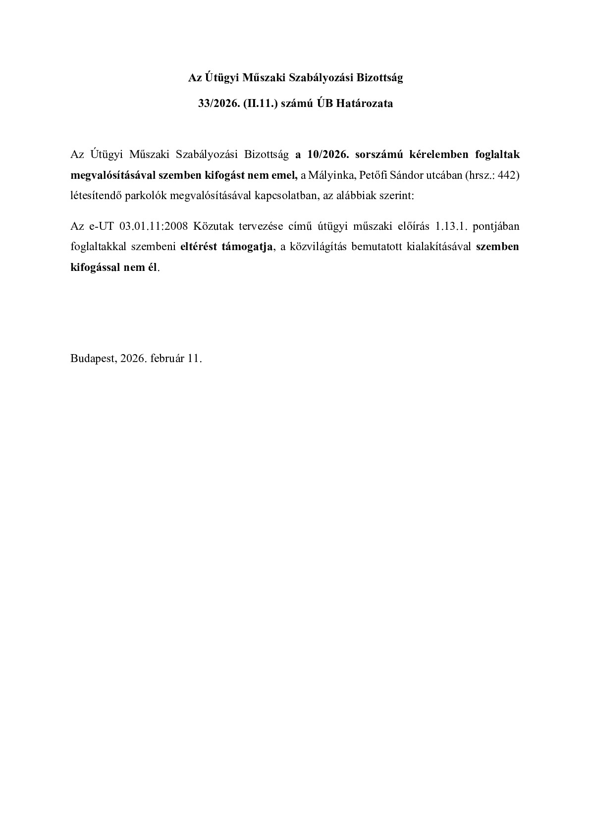 33/2026. (II.11.) ÚB Határozat - Mályinka, Petőfi Sándor utcában (hrsz.: 442) létesítendő parkolók megvalósítása
