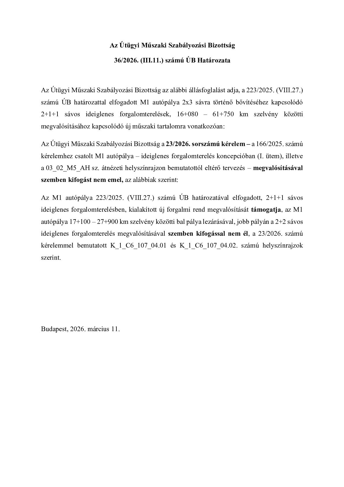 36/2026. (III.11.) ÚB határozat - M1 autópálya 2x3 sávra történő bővítéséhez kapcsolódó 2+1+1 sávos ideiglenes forgalomterelések, 16+080 – 61+750 km szelvény közötti megvalósítása