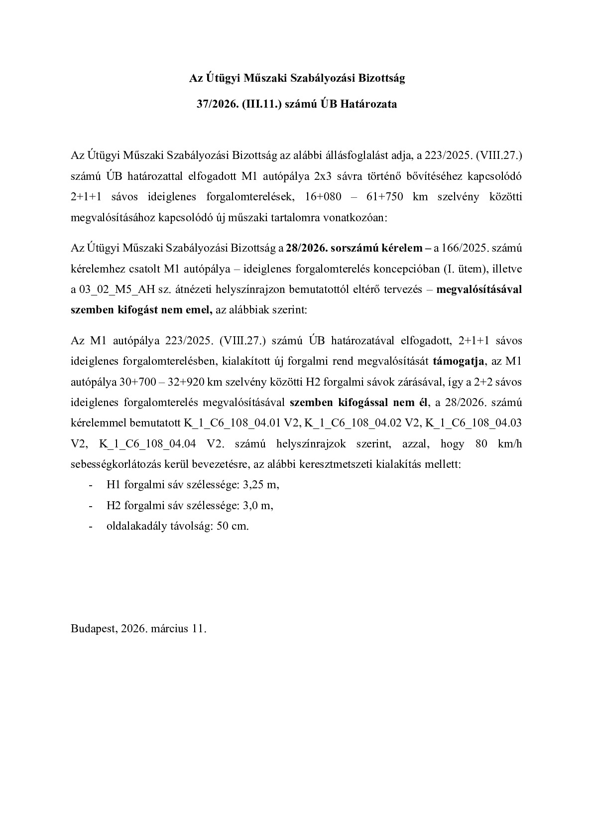 37/2026. (III.11.) ÚB határozat - M1 autópálya 2x3 sávra történő bővítéséhez kapcsolódó 2+1+1 sávos ideiglenes forgalomterelések, 16+080 – 61+750 km szelvény közötti megvalósítása
